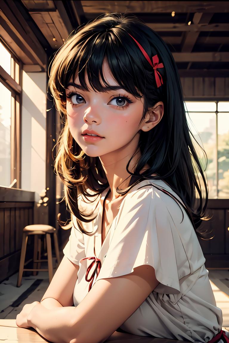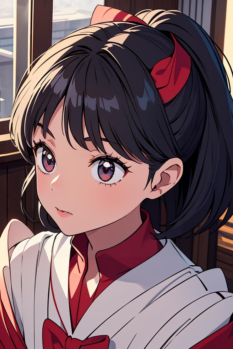 Moroh4, black hair, brown eyes, long hair, ribbon on hair, looking at viewer, bangs, collarbone, ponytail, japanese red clothes