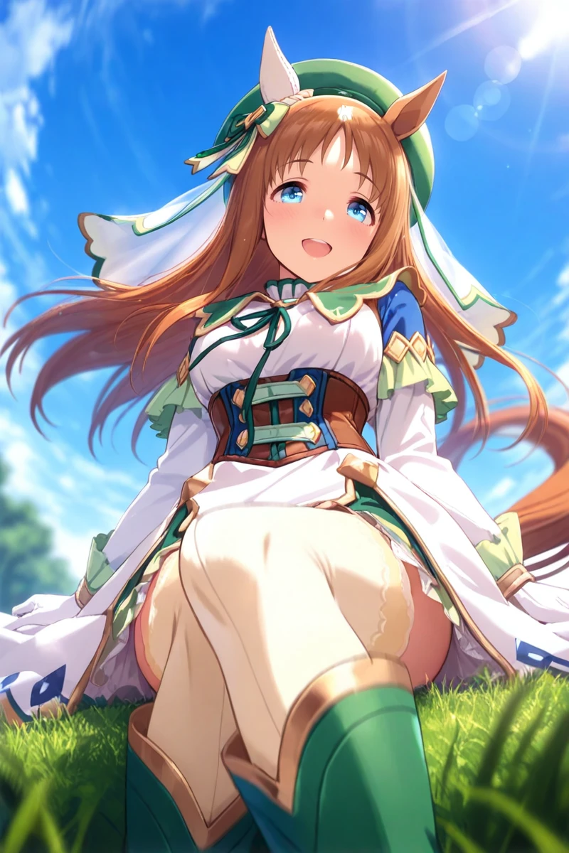 horse ears, white gloves, cream thighhighs, green boots, green headwear, horse tail, veil, beret, green hair bow, cream dress, green miniskirt, corset, nun dress, underskirt, long sleeves