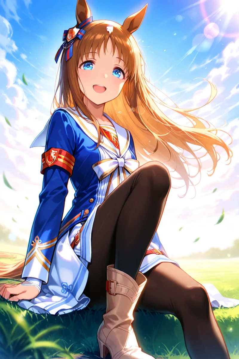 horse ears, horse tail, brown pantyhose, high heel boots, asymmetrical footwear, mismatched footwear, white dress, white skirt, white sailor collar, blue jacket, long sleeves, black footwear, cream footwear
