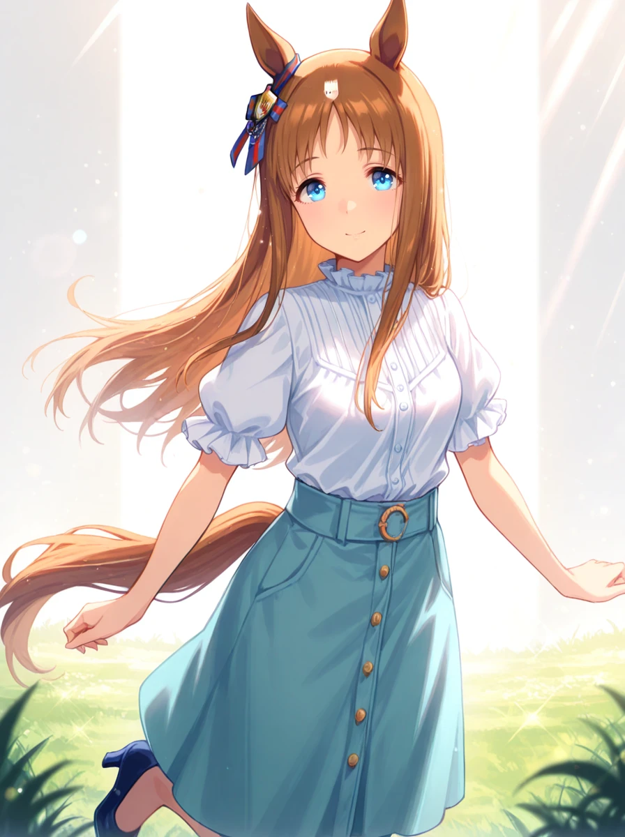 horse ears,horse tail, high heels, white shirt, light blue skirt, puffy short sleeves, casual, frilled shirt, pencil skirt, high-waist skirt, medium skirt