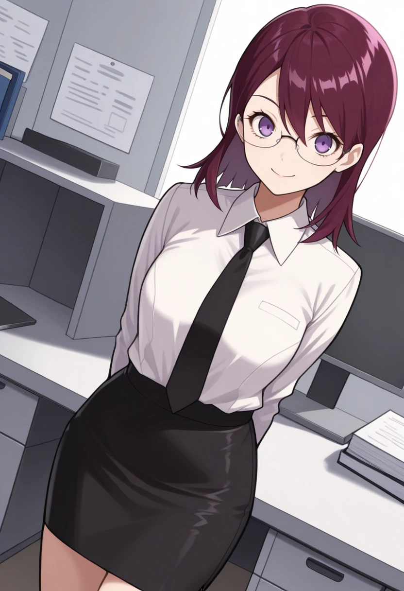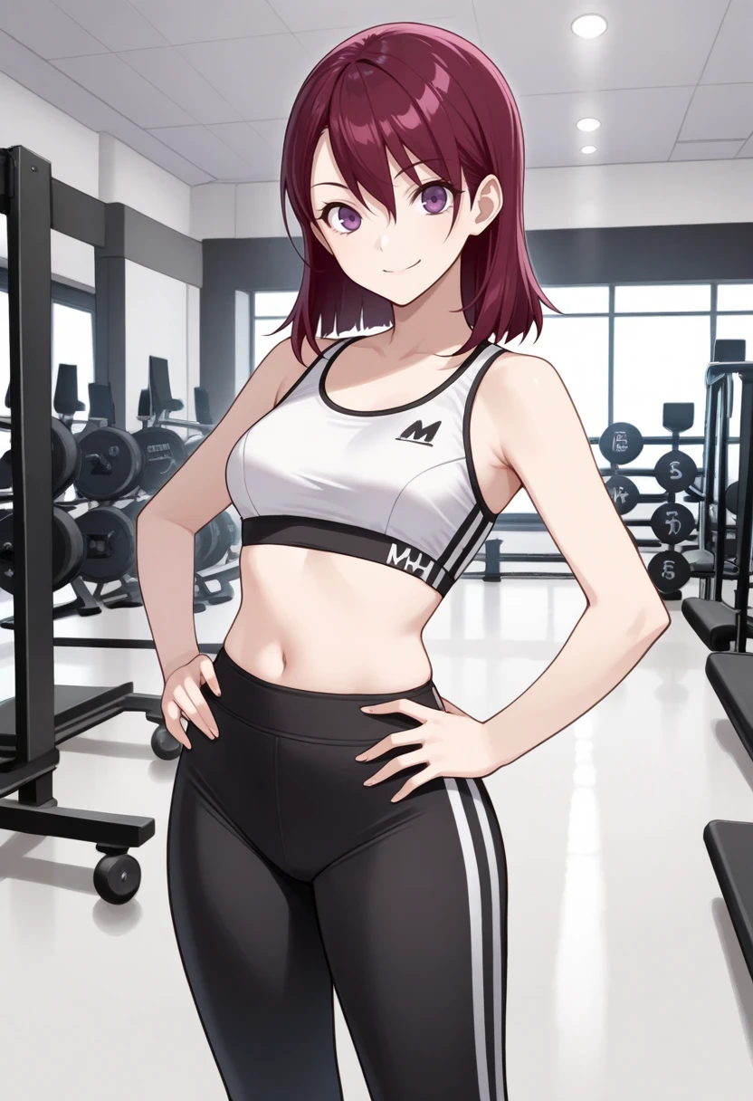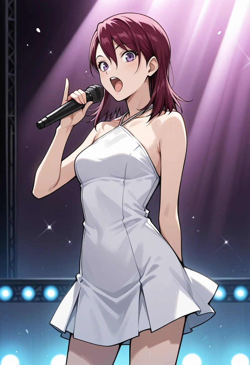m1h0p2, medium hair, crimson hair, purple eyes, white halterneck dress,