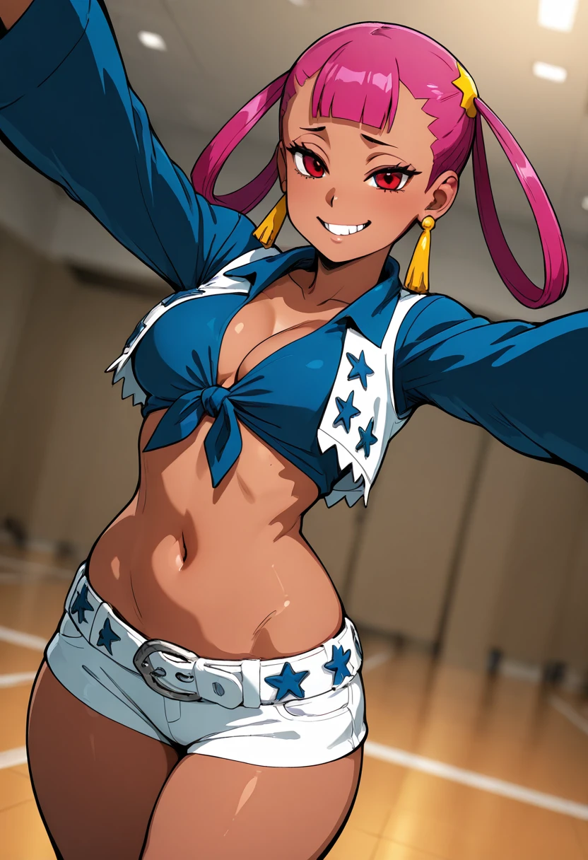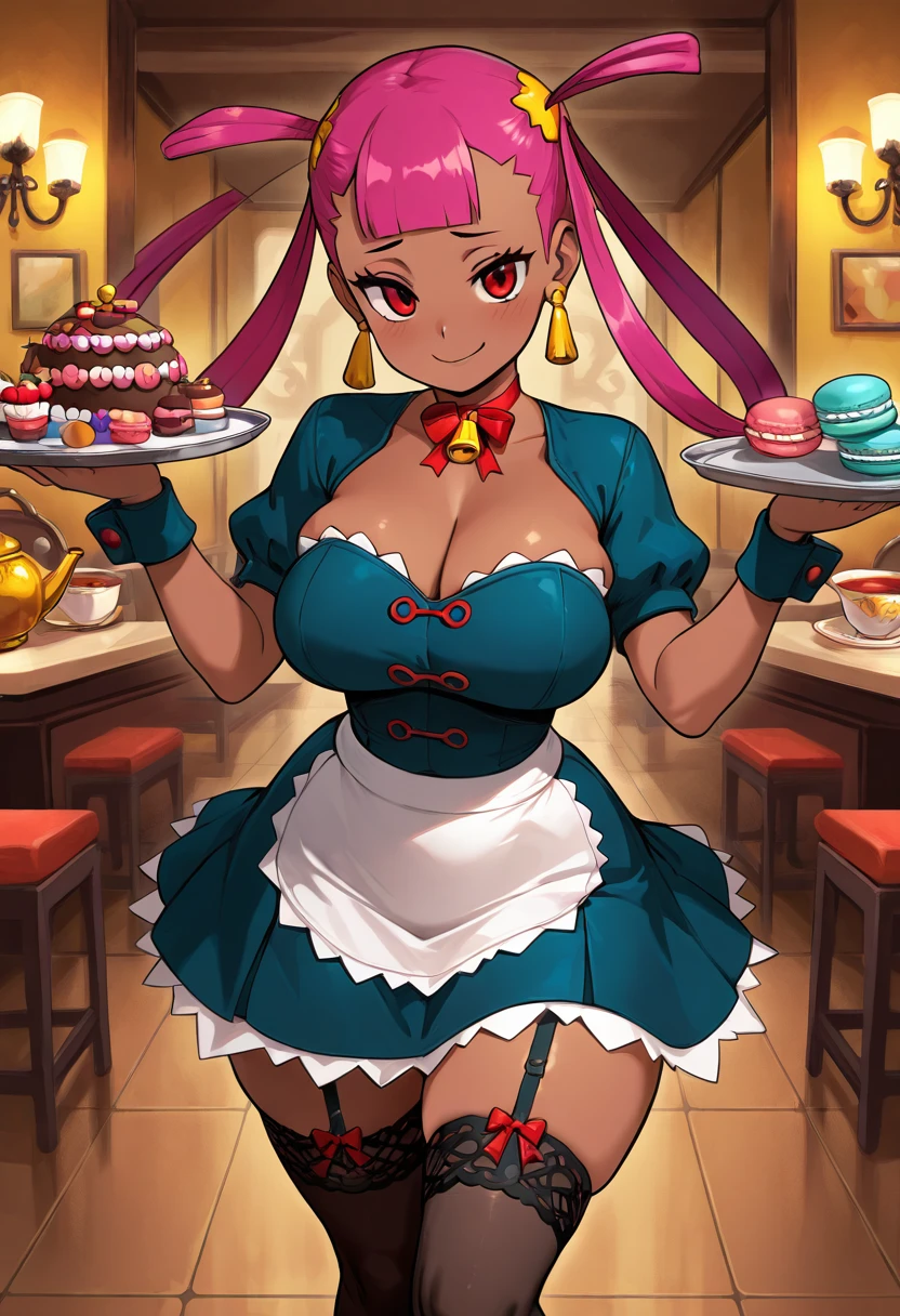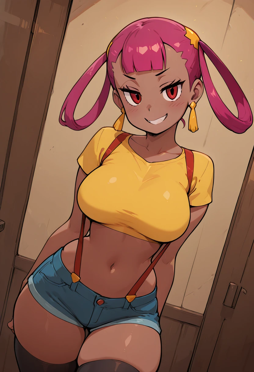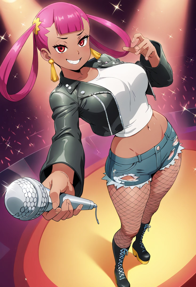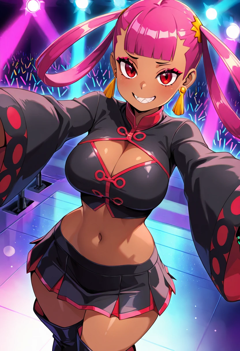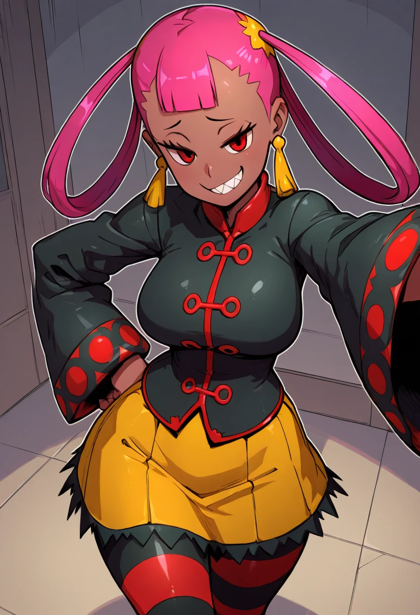 zzPunkg, red eyes, pink hair, hair rings, dark skin, jewelry, chinese clothes, black jacket, yellow skirt, striped pantyhose,