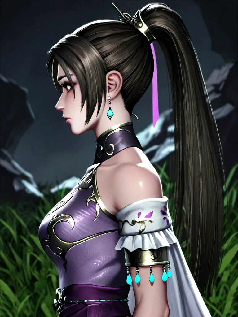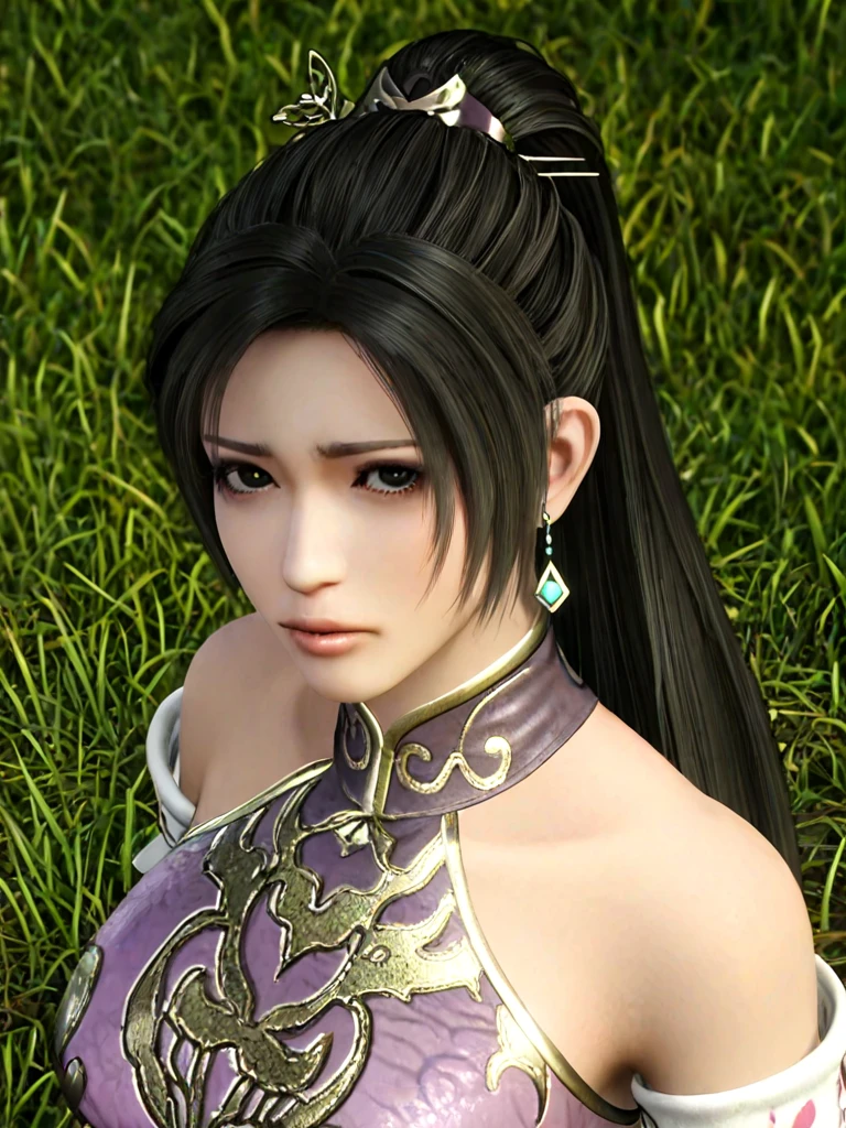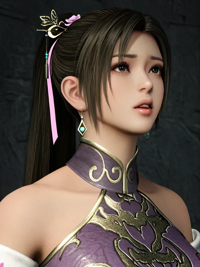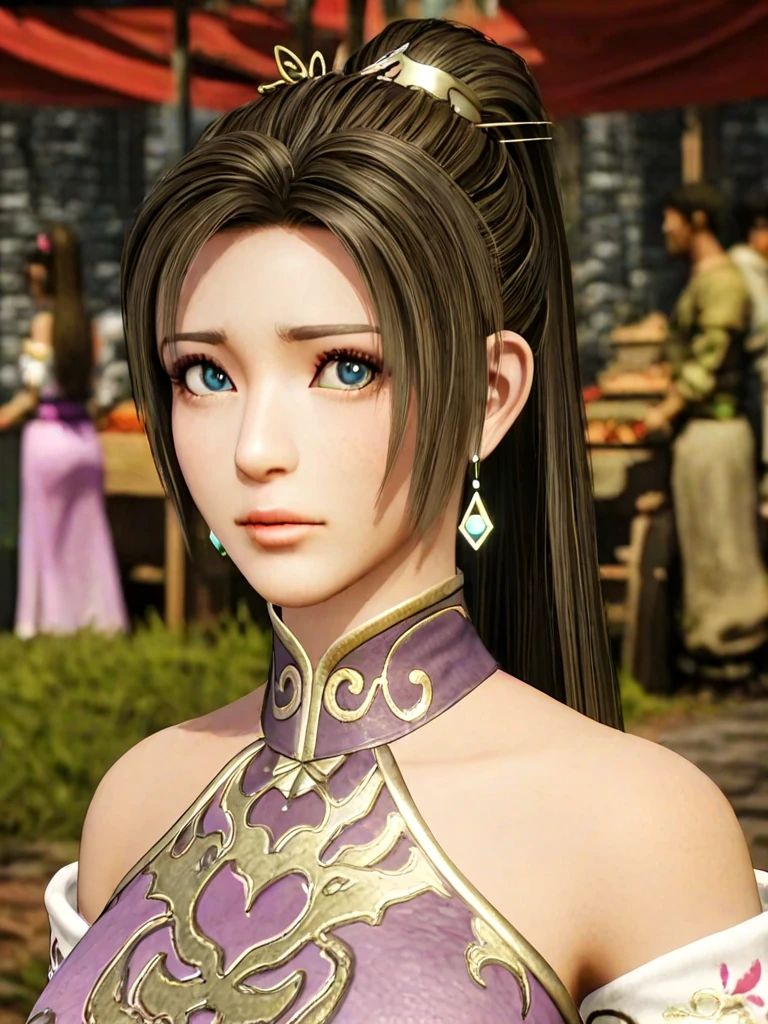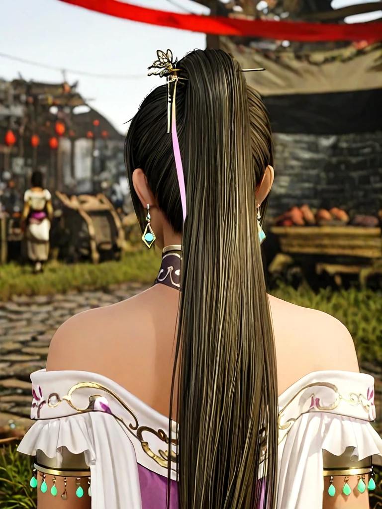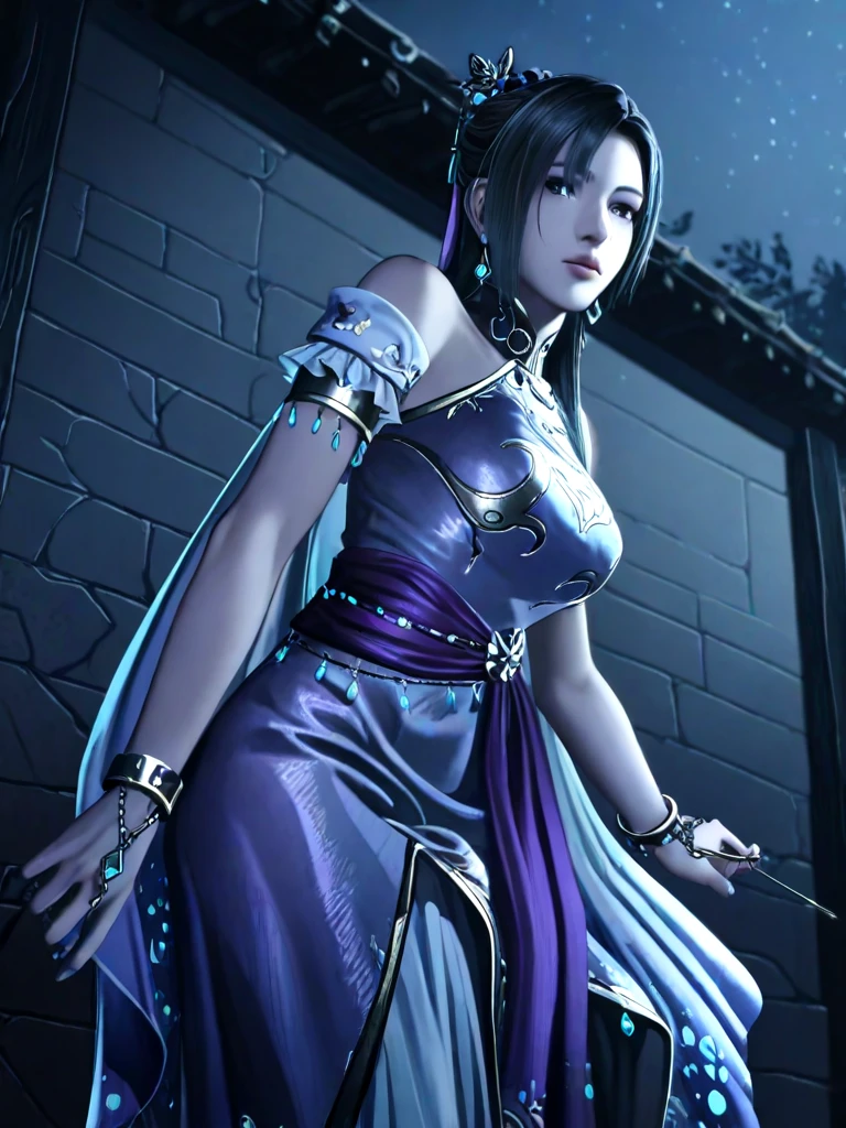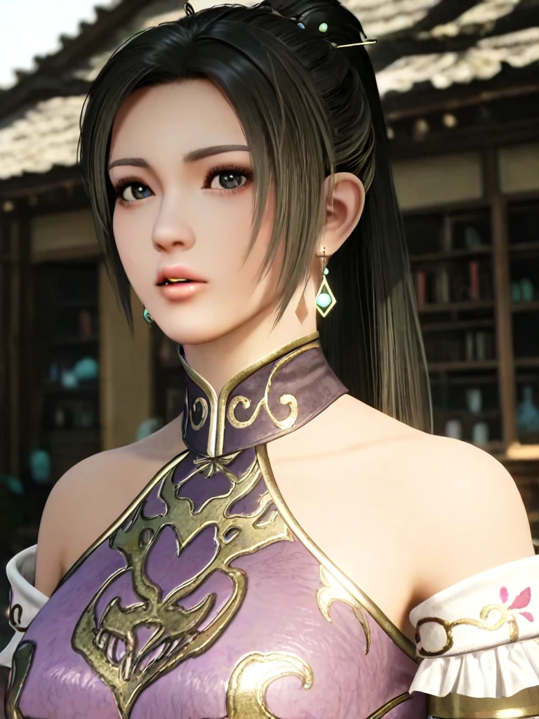 diaochan, 1girl, solo, skinny, hanfu, chinese clothes, ponytail, long hair, black hair, jewelry, earrings, hair ornament, bare shoulders, bracelet, dress,