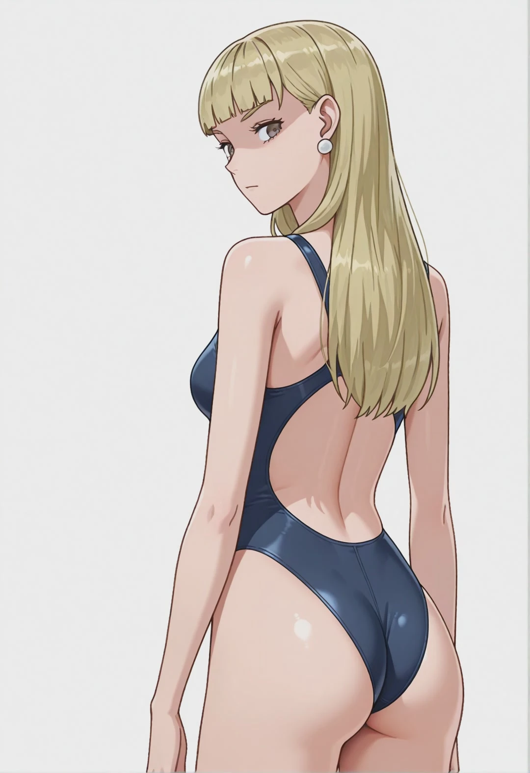 • da7, long hair, blunt bangs, blonde hair, brown eyes, earrings,
