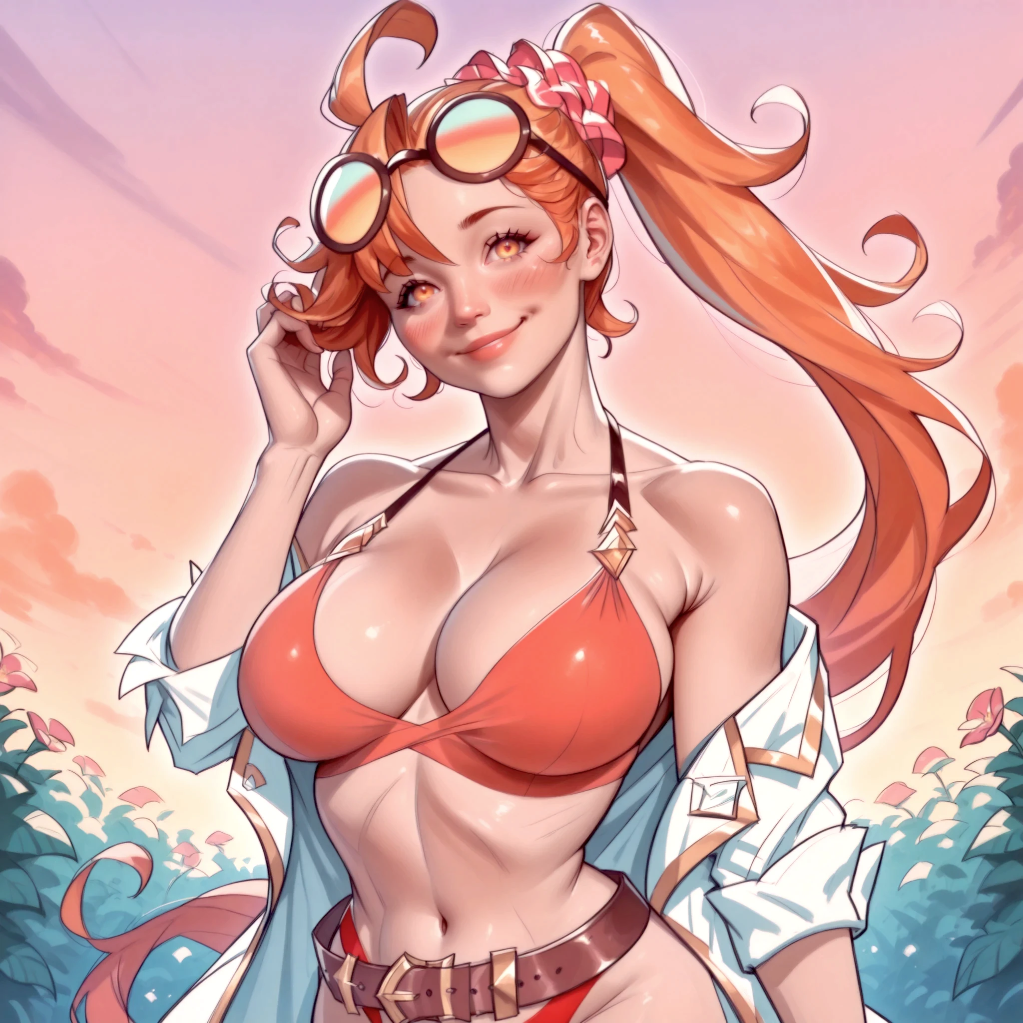 summersinoa, eyewear on head, ponytail, bikini, open coat, lab coat, belt,
