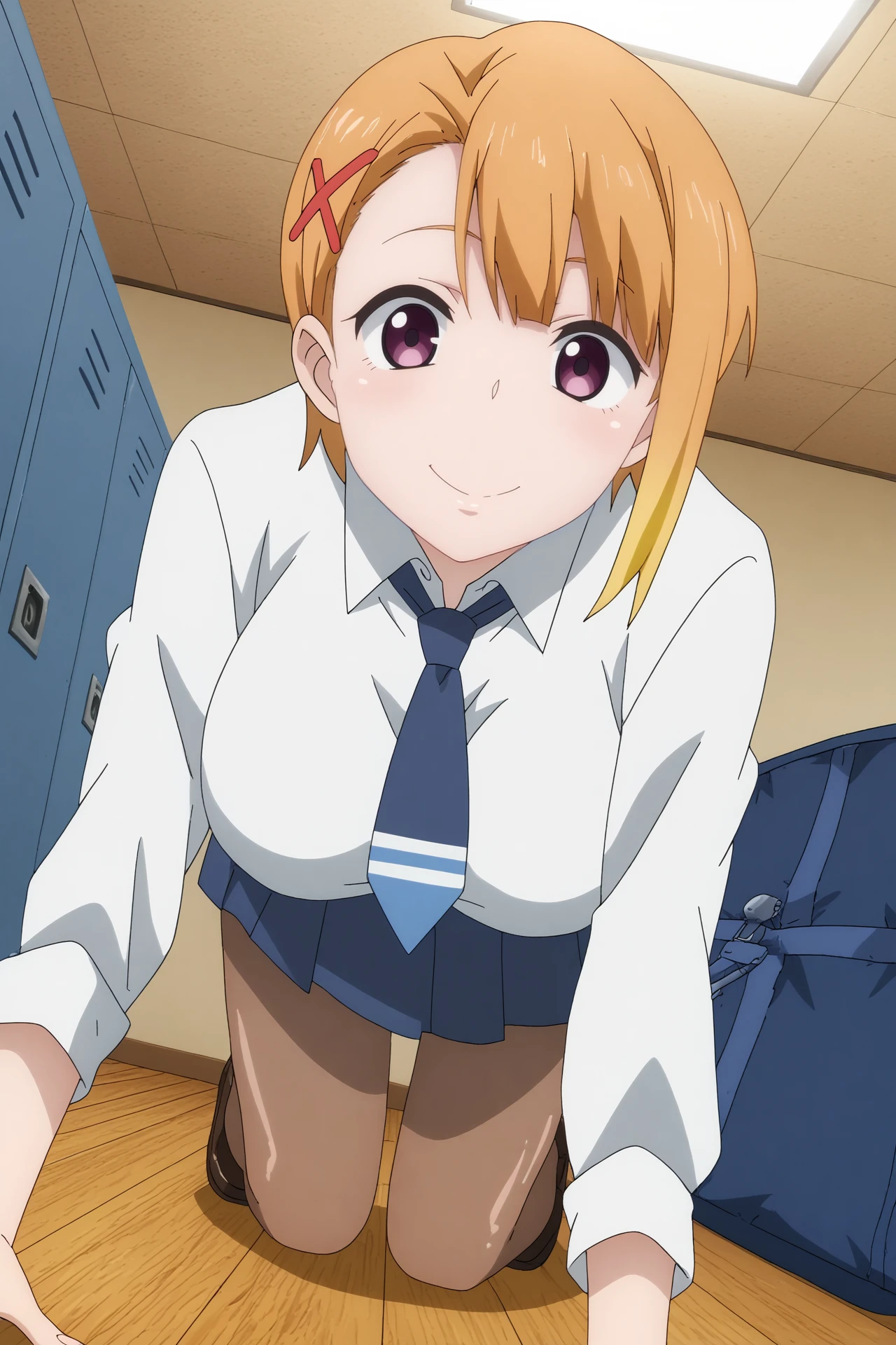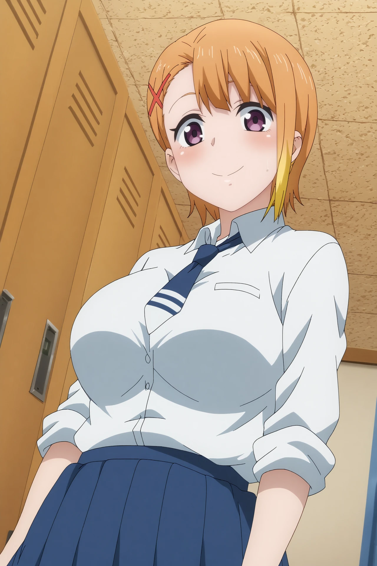 Triggers : hana yurikawa,1girl,solo,hair ornament,x hair ornament,short hair,hairclip,blonde hair,necktie,school uniform,shirt,looking at viewer,breasts,large breasts