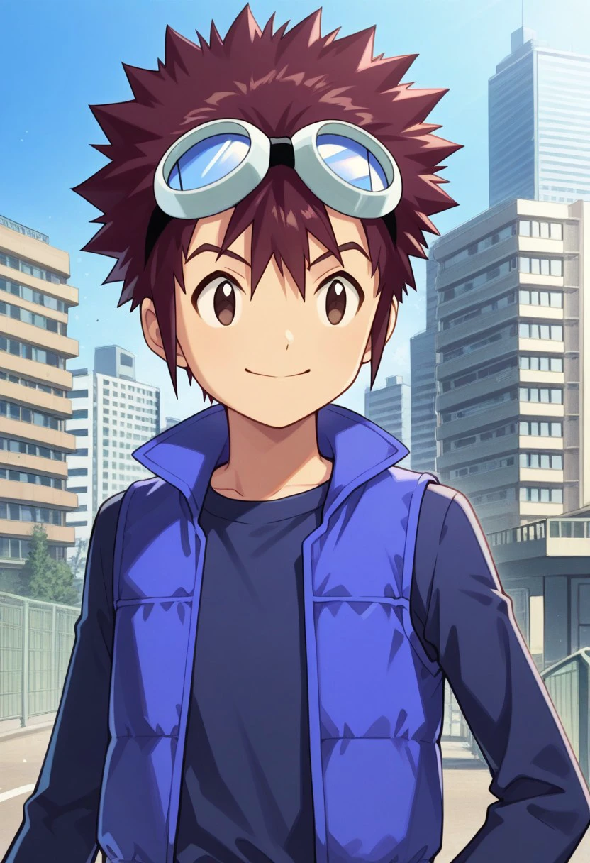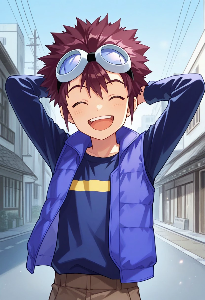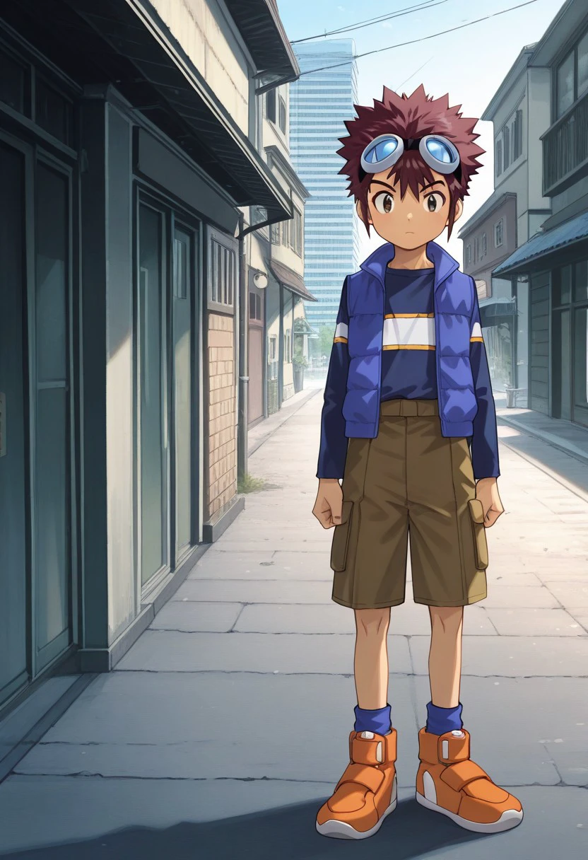 davismotomiya, 1boy, male focus, solo, brown eyes, brown hair, short hair, spiked hair, goggles, goggles on head, shirt, long sleeves, blue shirt, vest, blue vest, open clothes, shorts, brown shorts, socks, blue socks, shoes, orange footwear,