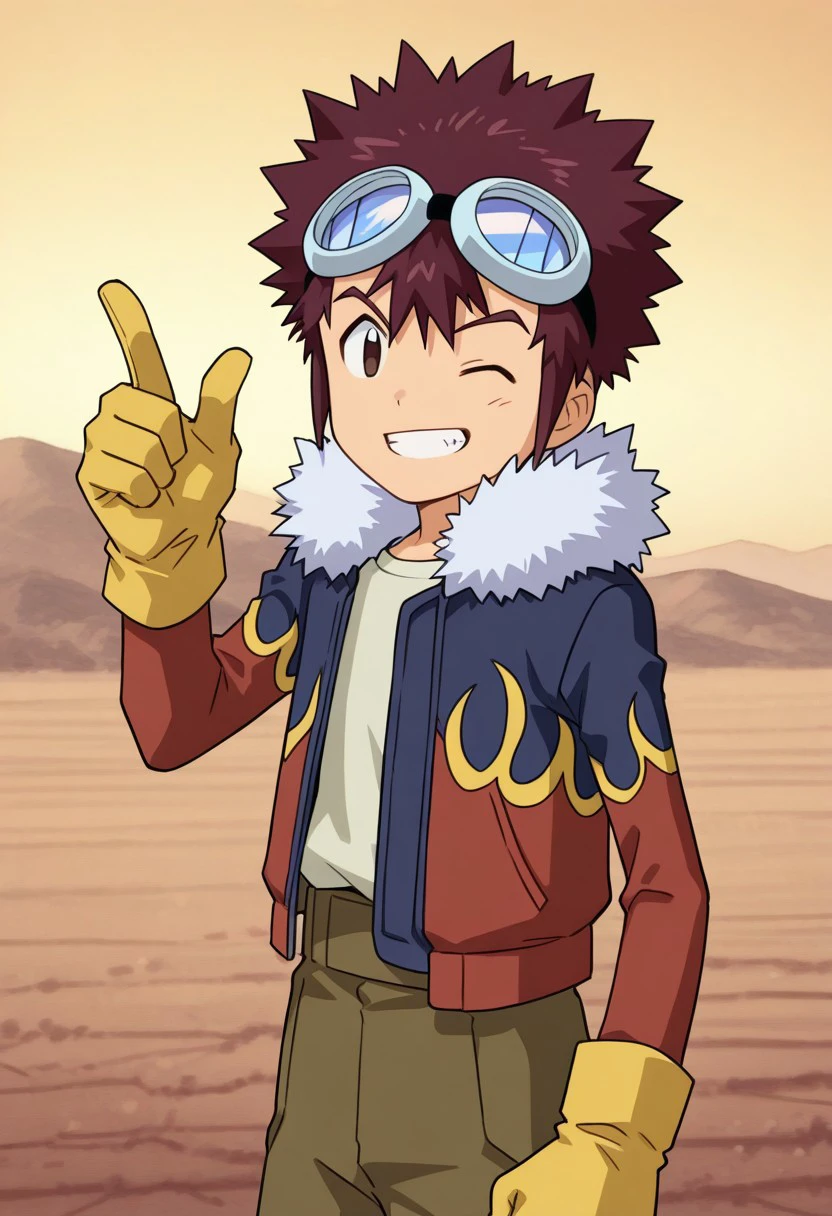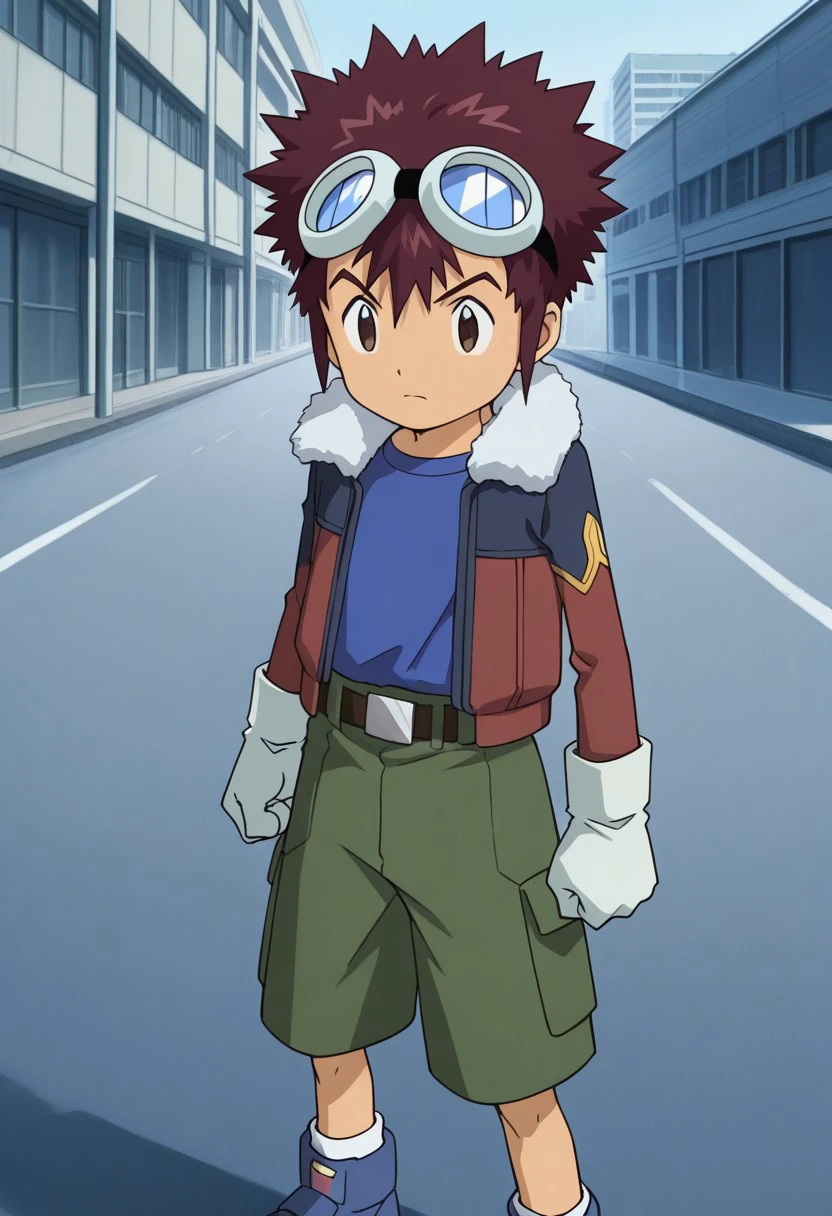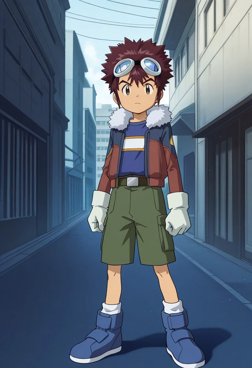 davismotomiya, 1boy, male focus, solo, brown eyes, brown hair, short hair, spiked hair, goggles, goggles on head, shirt, blue shirt, jacket, fur trim, fur-trimmed jacket, long sleeves, open jacket, open clothes, gloves, white gloves, belt, shorts, green shorts, socks, white socks, shoes, blue footwear,