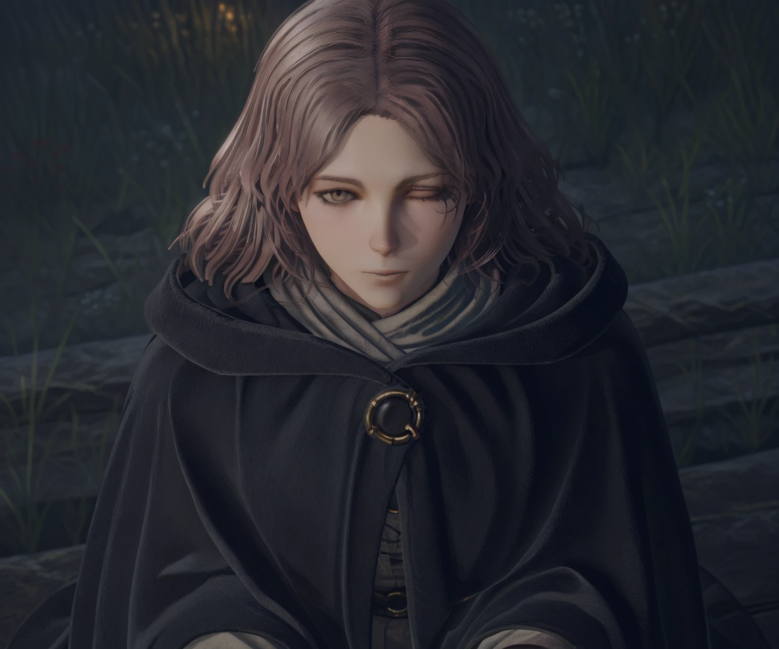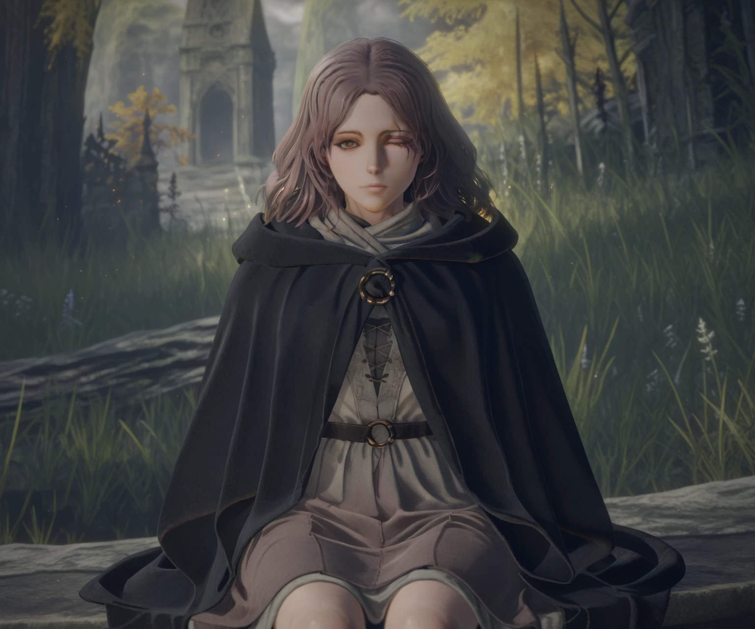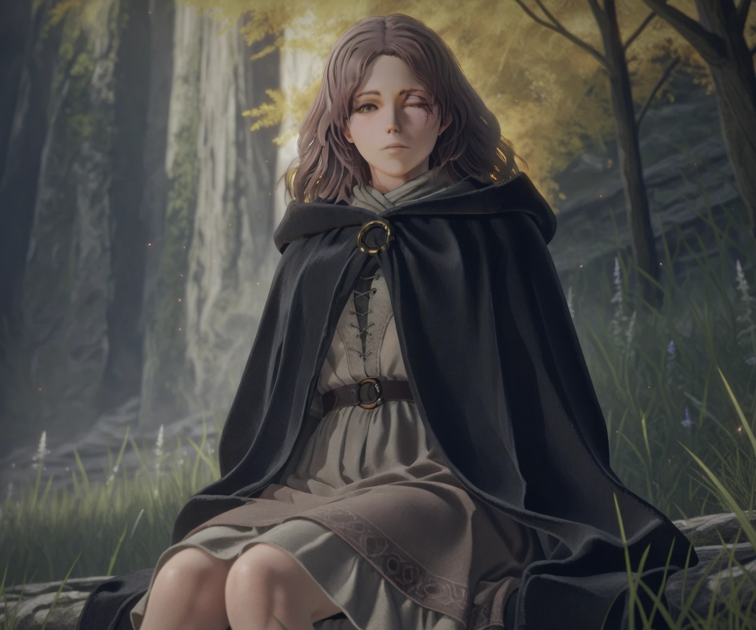 melina \(elden ring\), one-eyed, one eye closed, scar across eye, brown eyes, brown hair, medium hair, black cloak, hooded cloak, hood down, shirt, skirt,