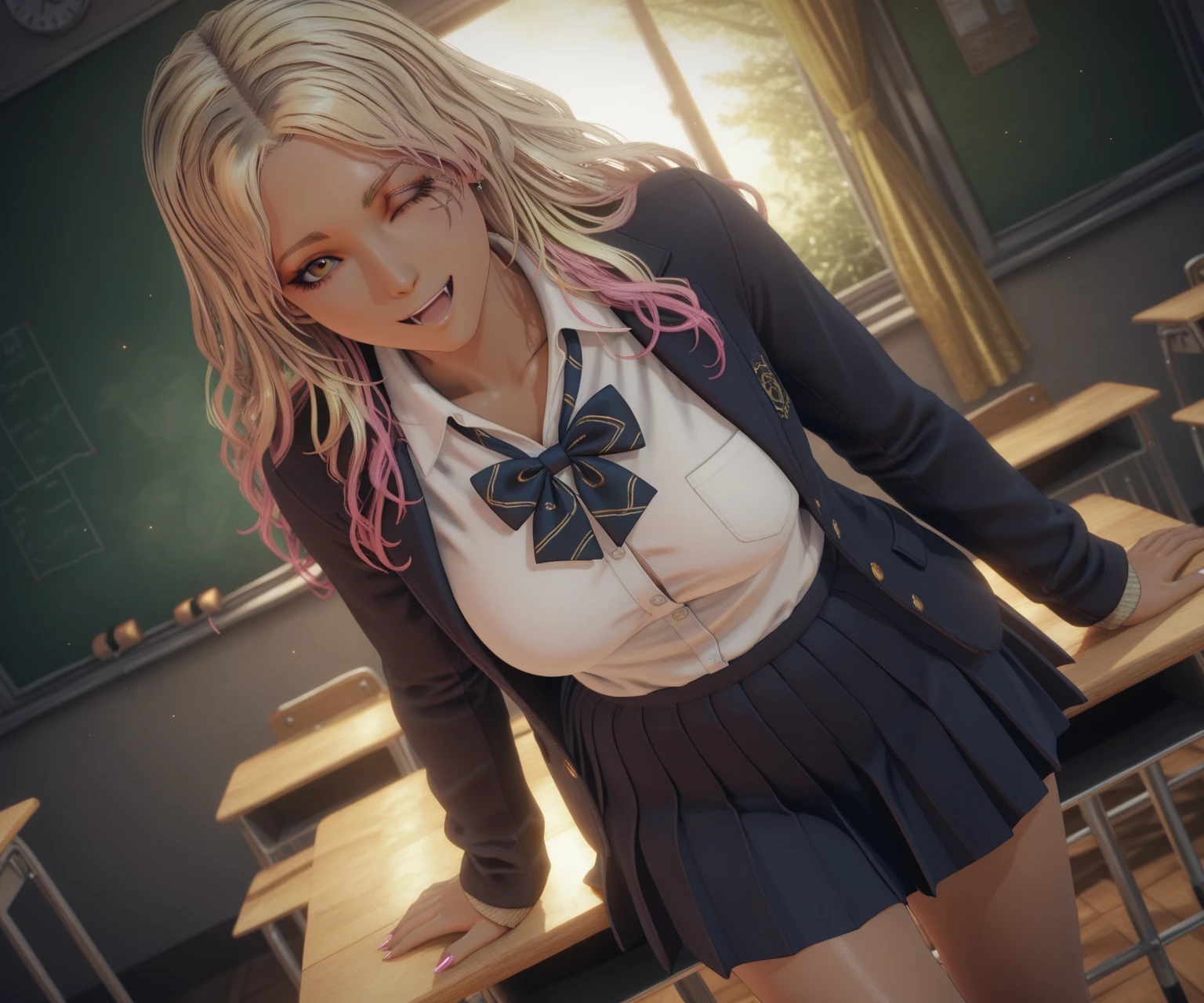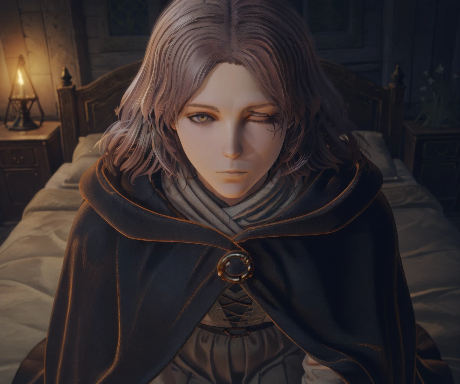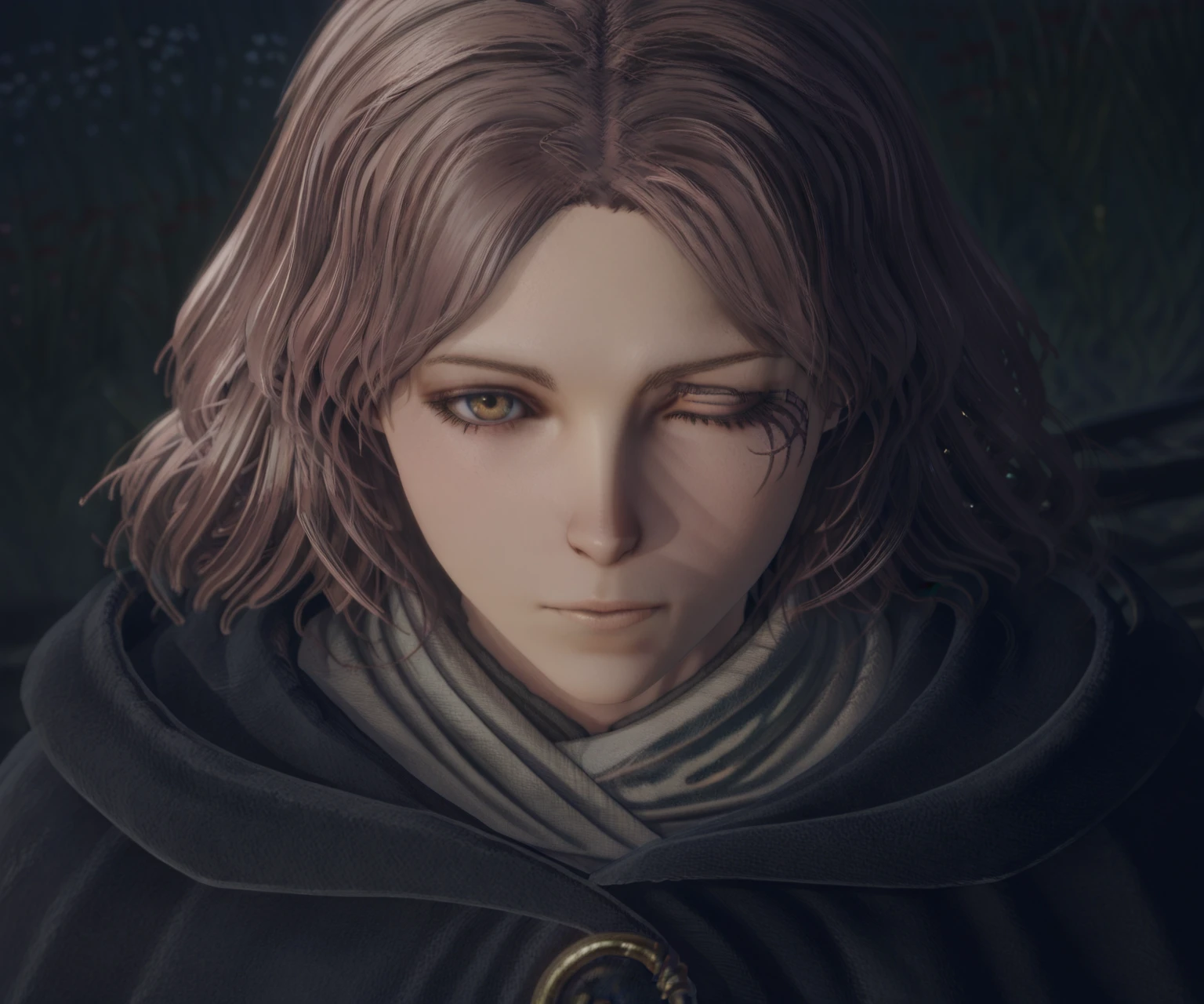 melina \(elden ring\), one-eyed, one eye closed, scar across eye, brown eyes, brown hair, medium hair, black cloak, hooded cloak, hood down, shirt, skirt,