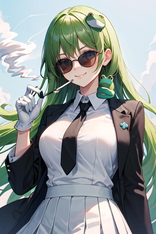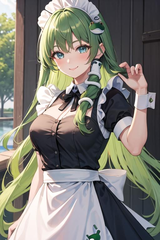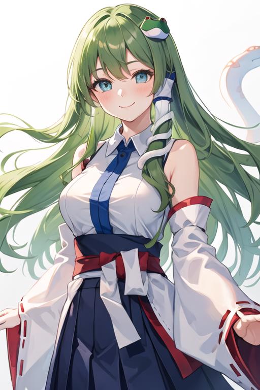 The trigger word is kochiya_sanae_touhou, and the recommended tags are best quality, masterpiece, highres, solo, {kochiya_sanae_touhou:1.15}, green_hair, long_hair, hair_ornament, frog_hair_ornament, snake_hair_ornament, hair_tubes, blush, bangs, breasts, smile, green_eyes, upper_body, blue_eyes.