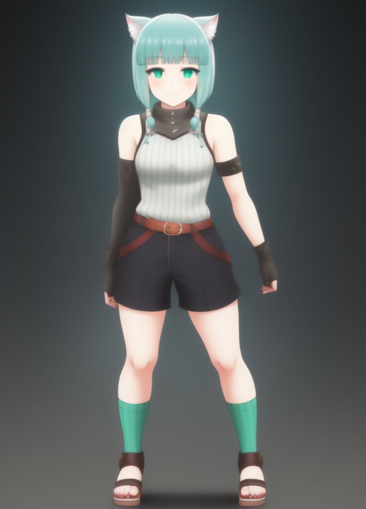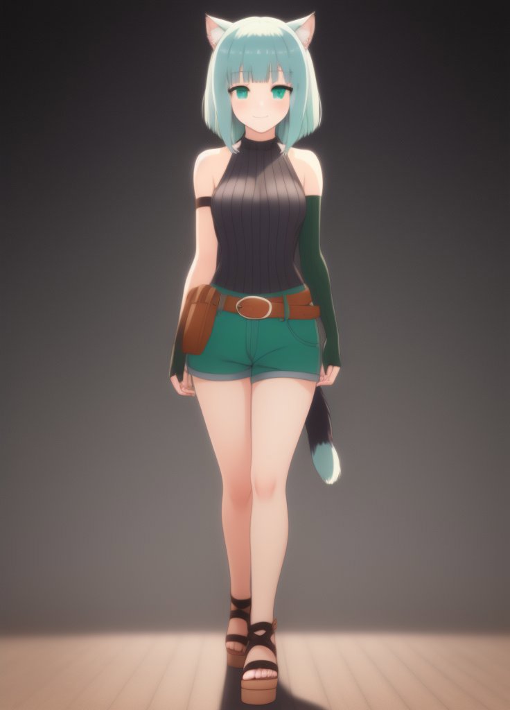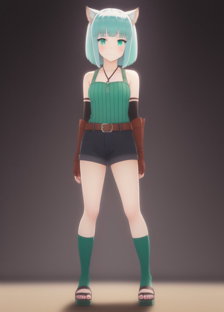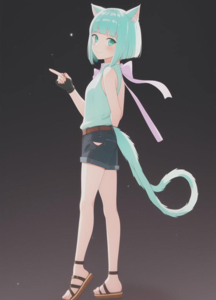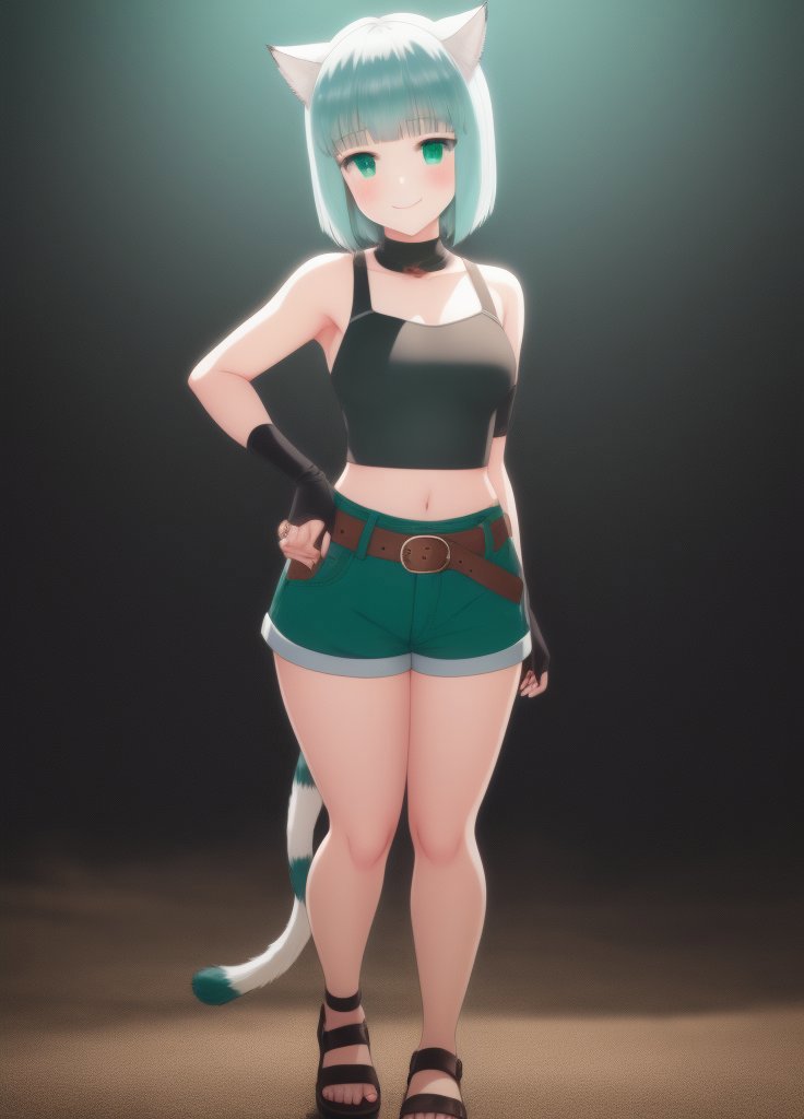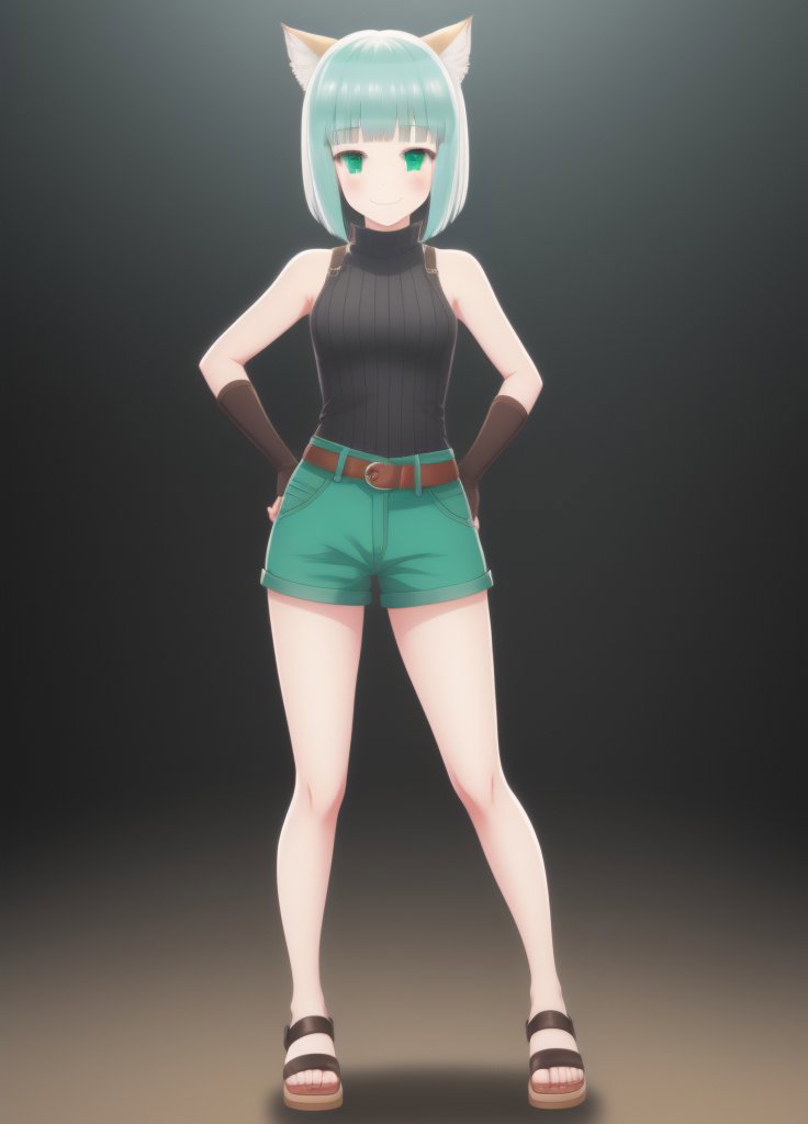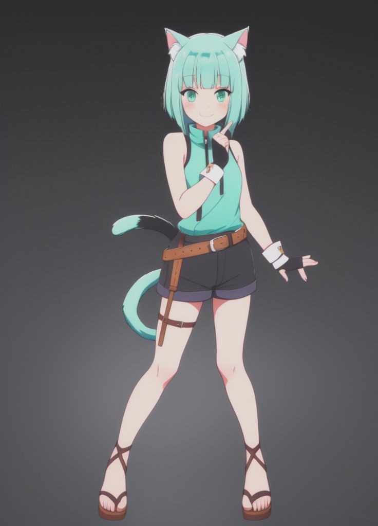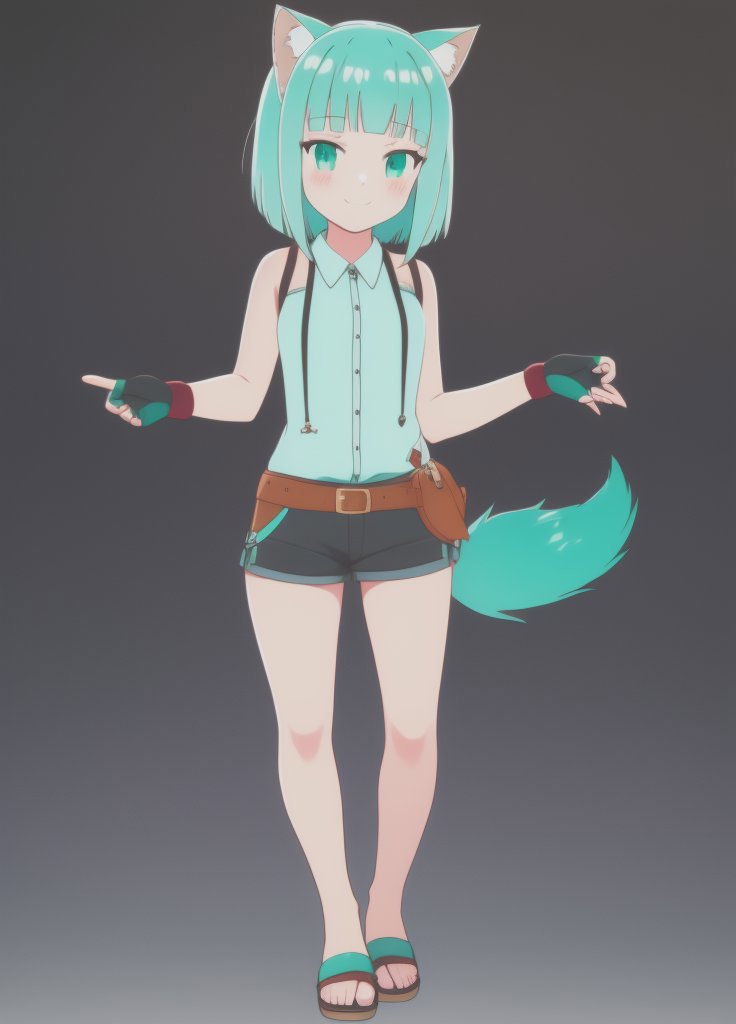 Shironeko, 1girl, animal ears, aqua eyes, aqua hair, bare shoulders, belt, black background, blunt bangs, blush, cat ears, cat girl, cat tail, closed mouth, fingerless gloves, full body, gloves, green eyes, looking at viewer, sandals, short hair, short shorts, shorts, sleeveless, smile, solo, standing, tail, toeless footwear
