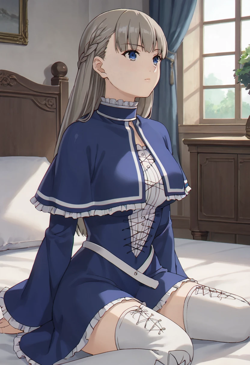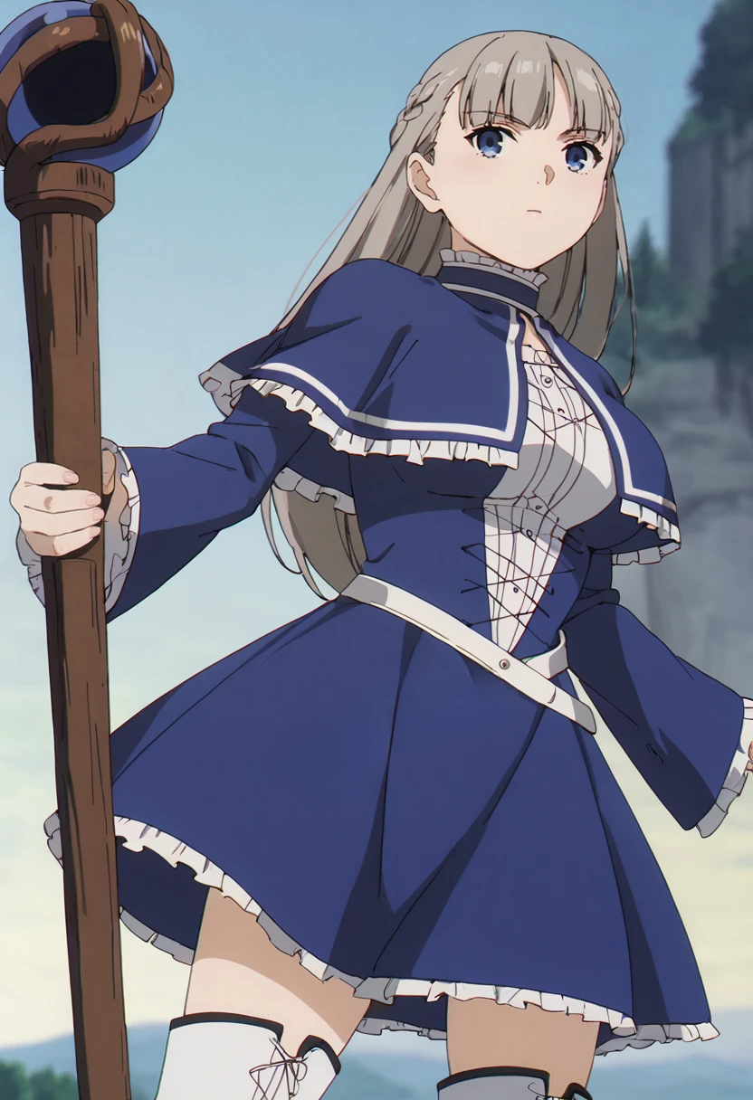 lawine \(sousou no frieren\),blue eyes, long hair,medium breasts,blue dress,frills,long sleeves,capelet,white knee boots