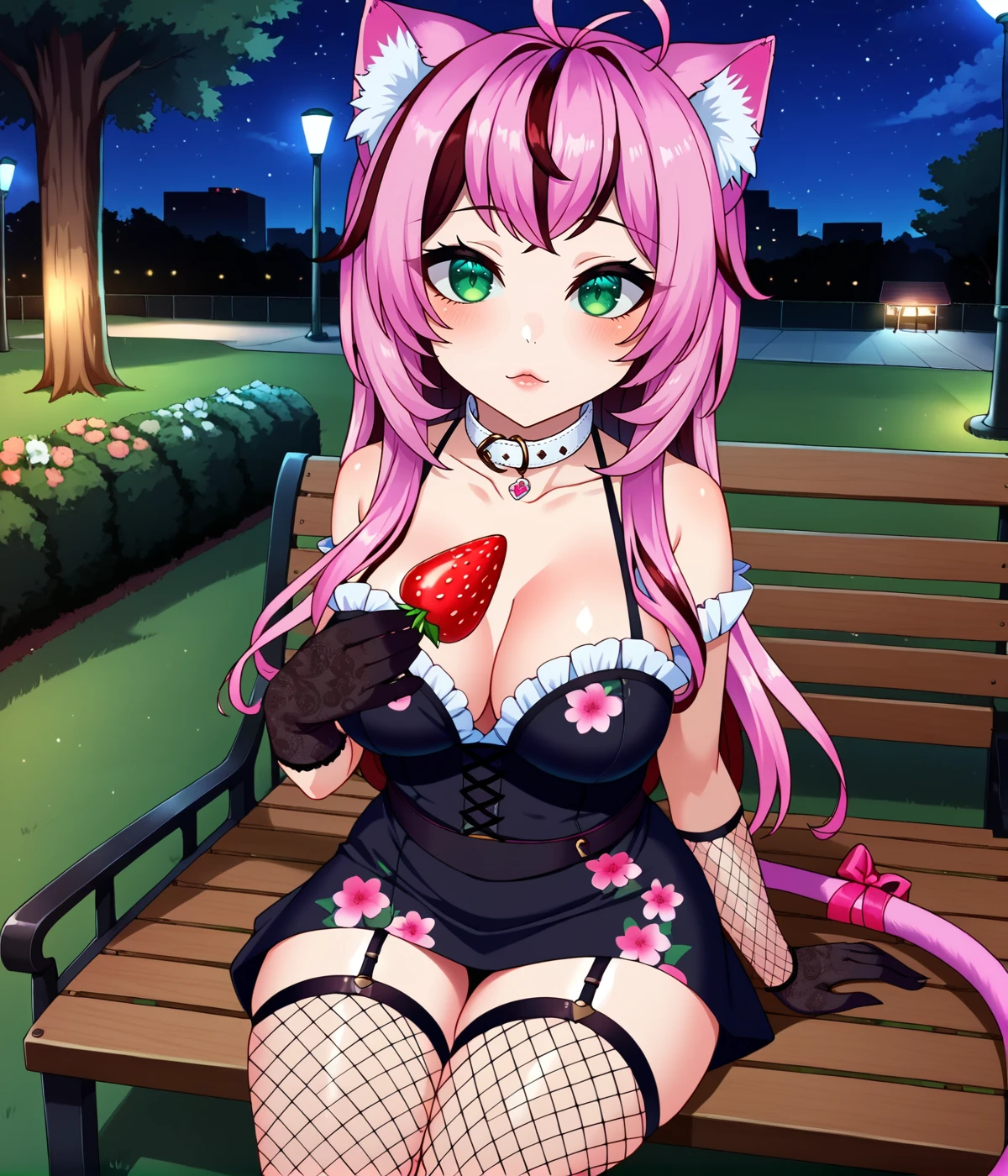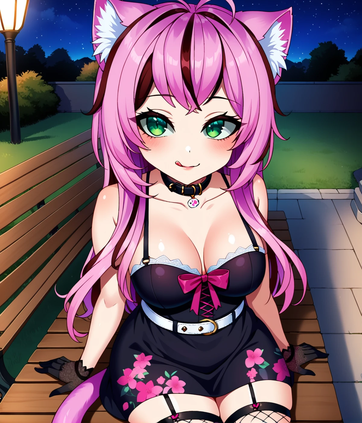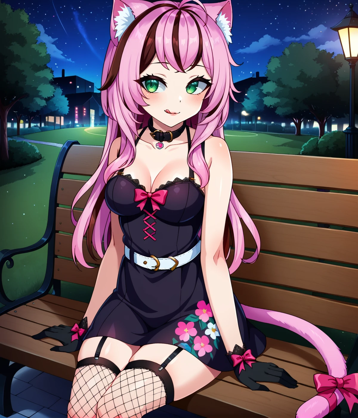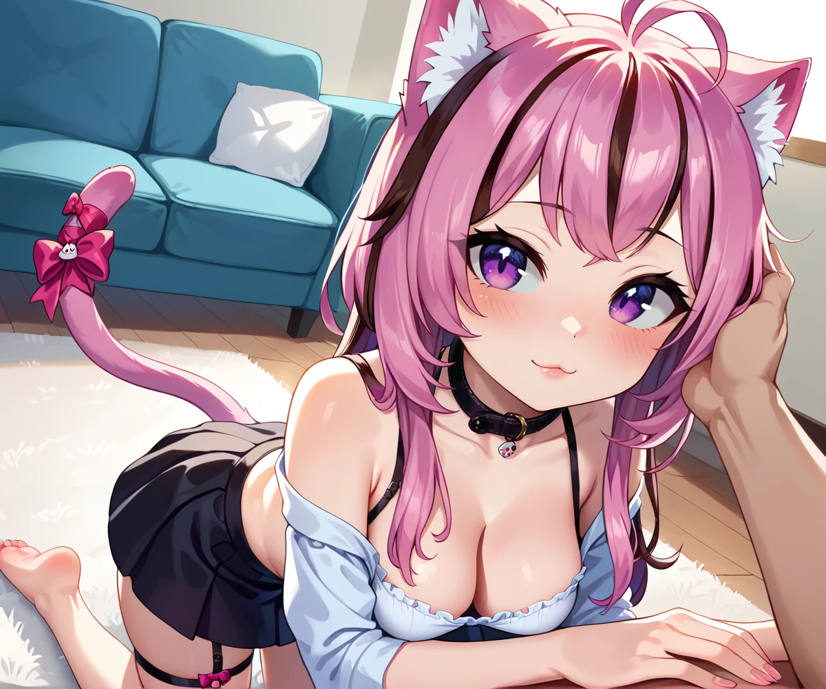 bow, animal_ears, tail, pink_hair, purple_hair, multicolored_hair, cat_ears, fingernails, cat_tail, tail_ornament, tail_bow, collar, belt_collar