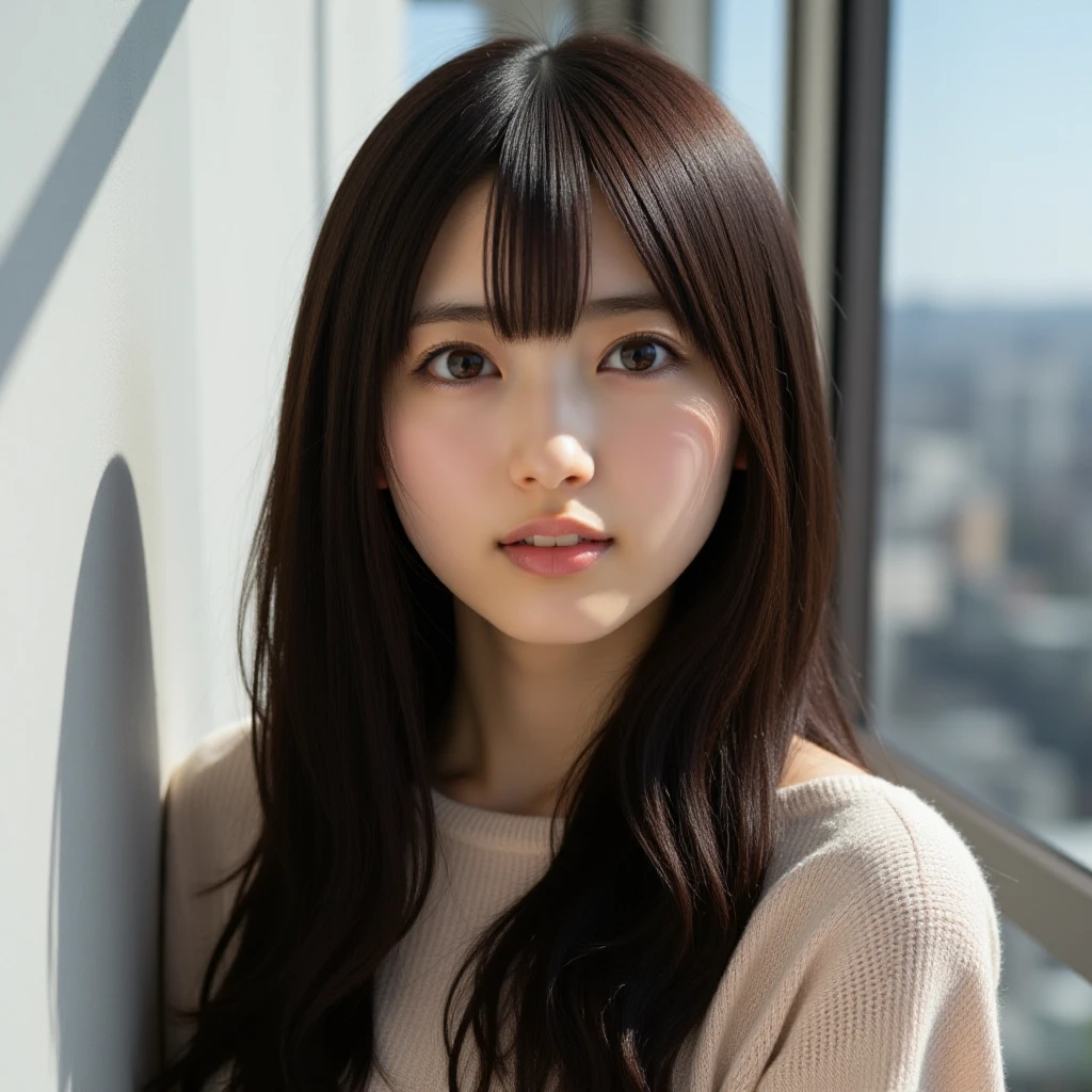 Photo of a japanese woman wearing beige sweater and skinny jeans pants.