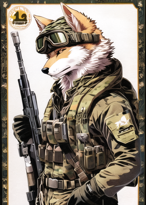 200 midjourny realistic style furry images trained on ayonimix, 150 of which are military-armed furry, so it should be good at that.
