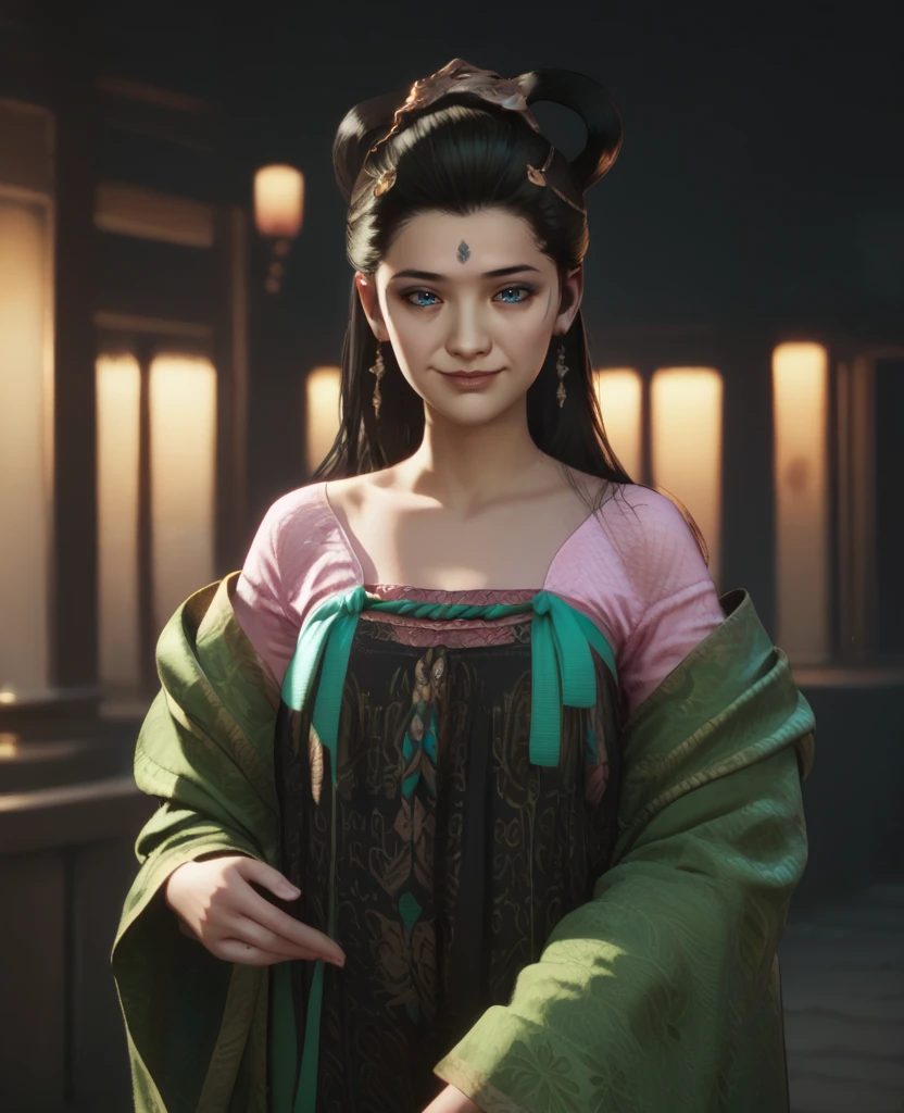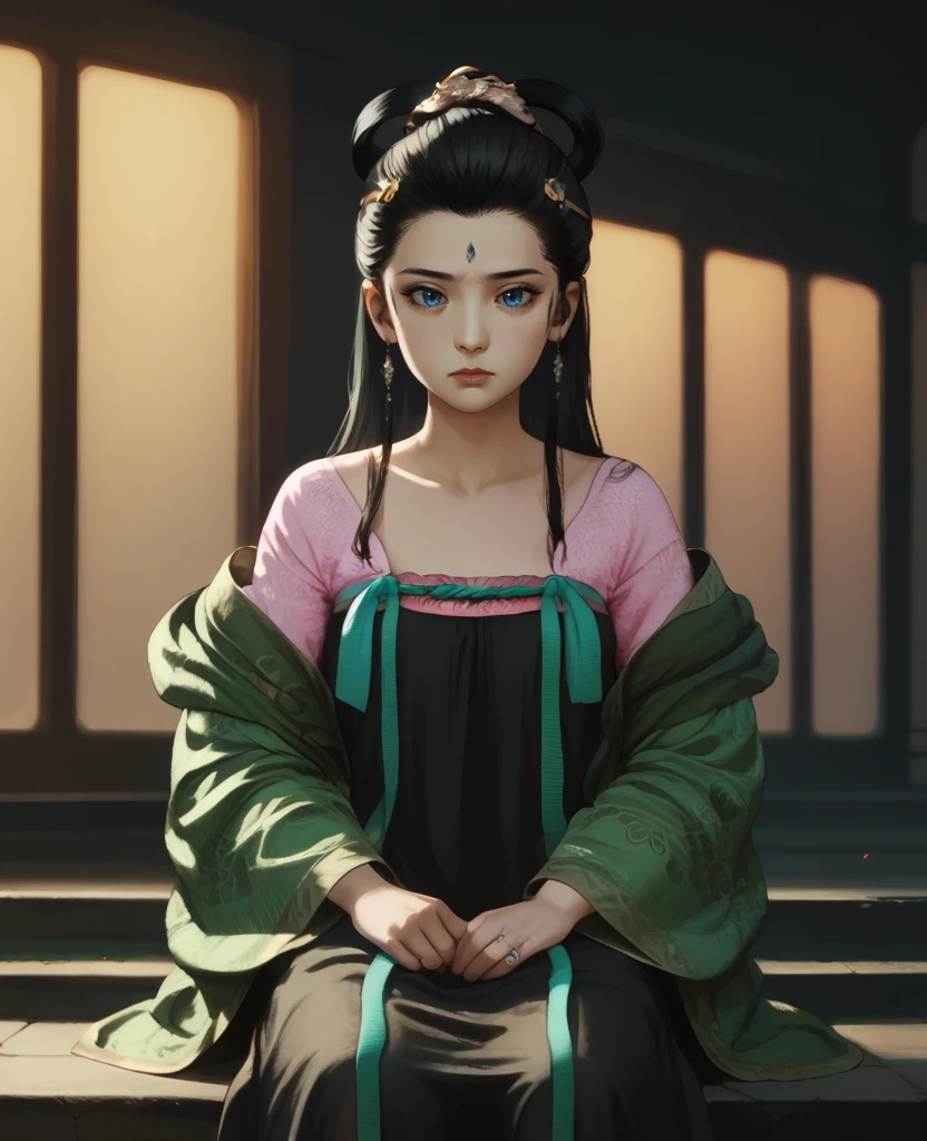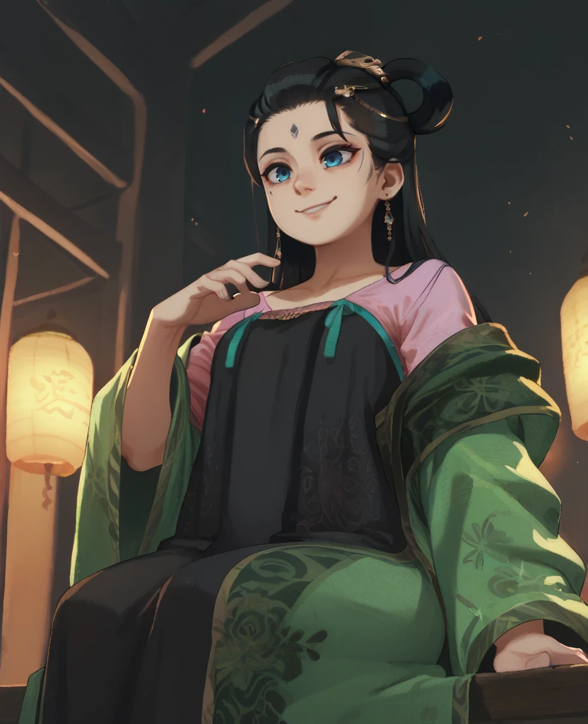 green robe,black dress, pink shirt, hair ornament,earrings,