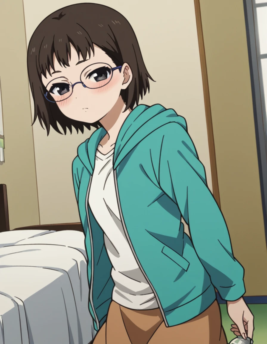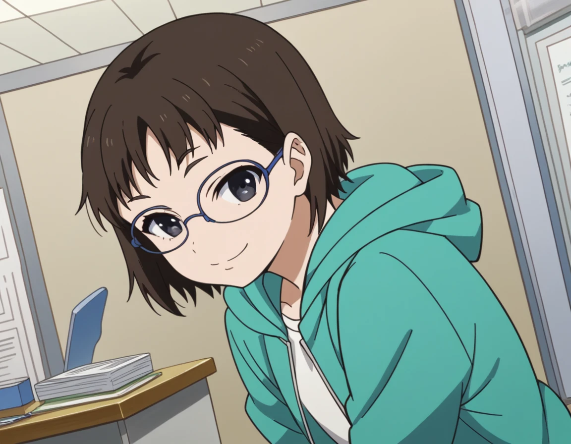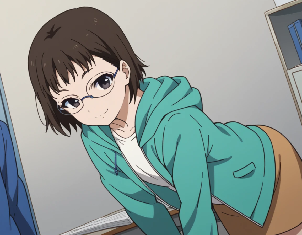 yumiiguchi, <lora:yumi-iguchi-s1-ponyxl-lora-nochekaiser:1>, yumi iguchi, short hair, brown hair, black hair, glasses, black eyes,