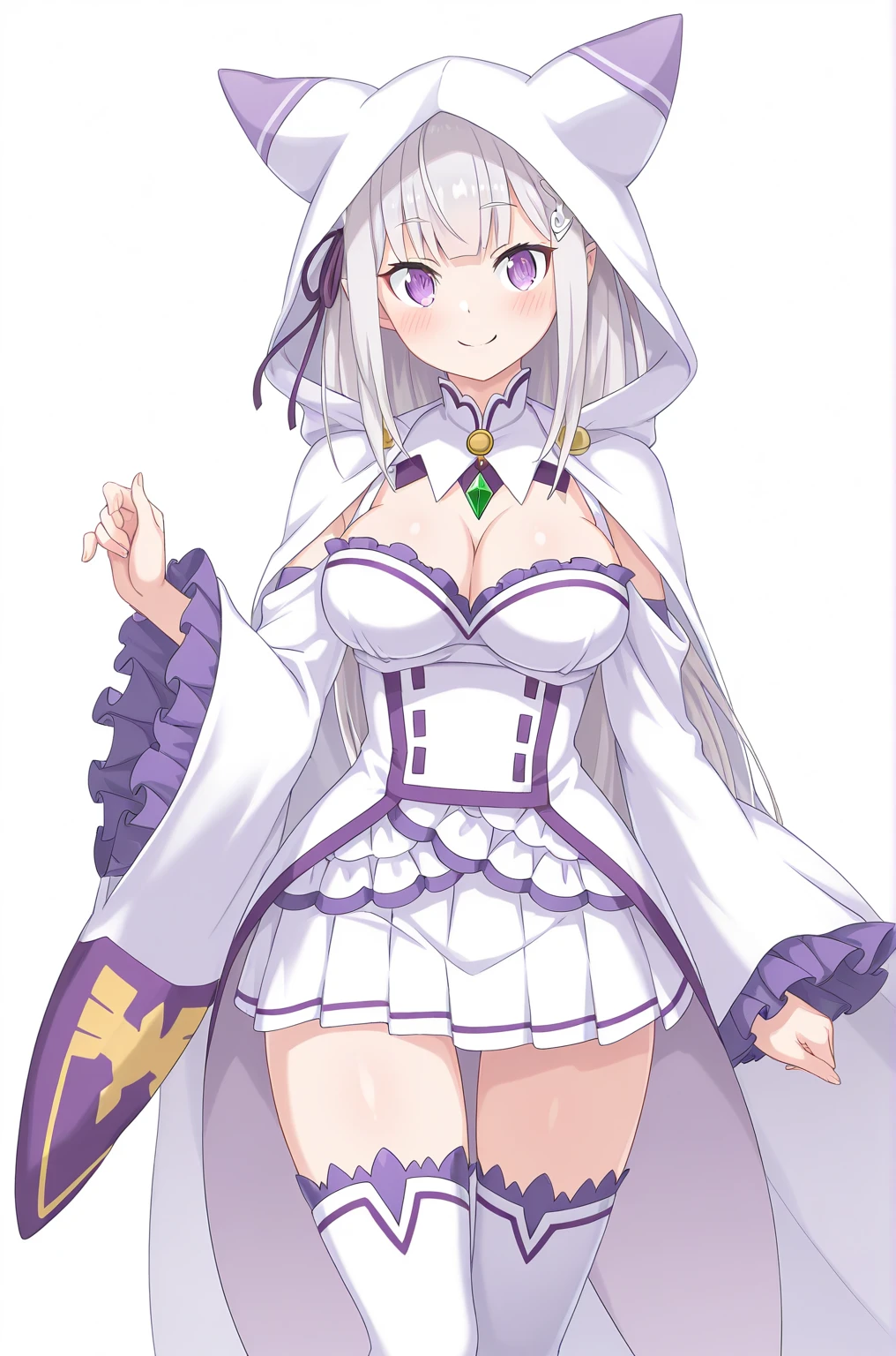 EmiliaS4-Liver020, 1girl, solo, purple full body bodysuit, white cloak, small white shirt, gold button, covered underboob, covered navel, golden button, white flower, white rose hair ornament, x hairclip, white hairclip, long silver hair, purple eyes, pointy ears, elf, white boots, head tilt, white cloak, camel toe, long hair, crown braid, white capelet, circular clasp, white hooded cloak, white capelet, ruffles, white sleeves, puffy sleeves, striped cuffs, pink cuffs, form-fitting, white covered underboob, hair tucked into hood, white fabric, clothing detailAdditional: