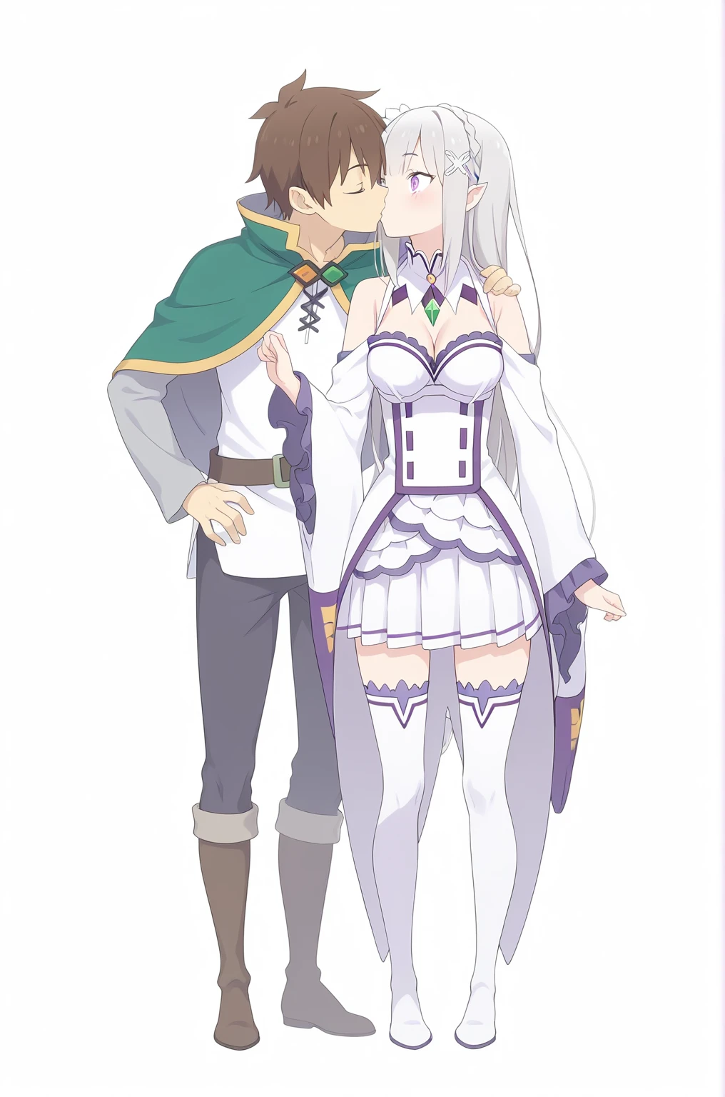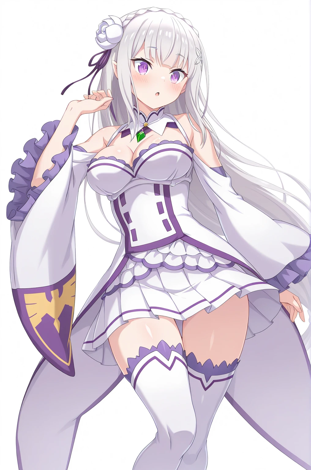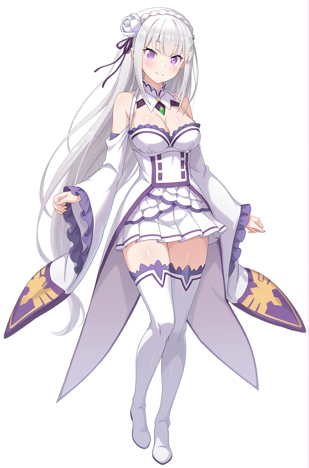 Emilia-Liver020, 1girl, solo, braid, crown braid, flower, hair flower, hair ornament, hair ribbon, long hair, pointy ears, white hair, x hair ornament, mature female, large breasts, detached collar, detached sleeves, frilled sleeves, frills, long sleeves, miniskirt, pleated skirt, ribbon, skirt, thighhighs, white skirt, white sleeves, white thighhighs, wide sleeves, zettai ryouikiAdditional:
