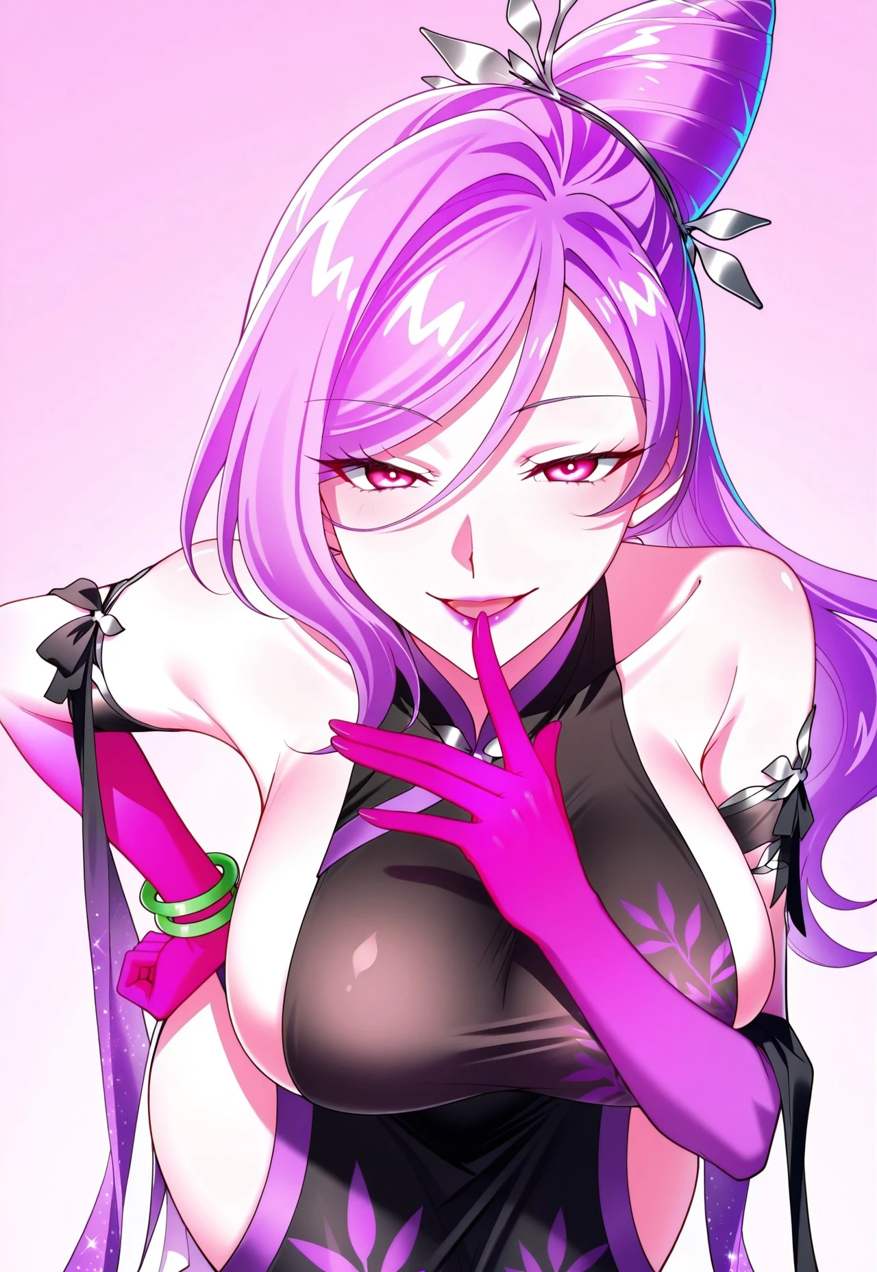 1girl, yll_gcs, Purple hair, waist-length hair, half-up high bun, single hair bun, loose long ponytail, hair tied with decorative band, silver leaf hair ornaments, side-parted layered bangs, thin fringe across forehead, long face-framing tendrils, long eyelashes, arched purple eyebrows, purple eyes, pink-mauve tone lips, hourglass figure, narrow waist, large breasts, long legs,Outfit: