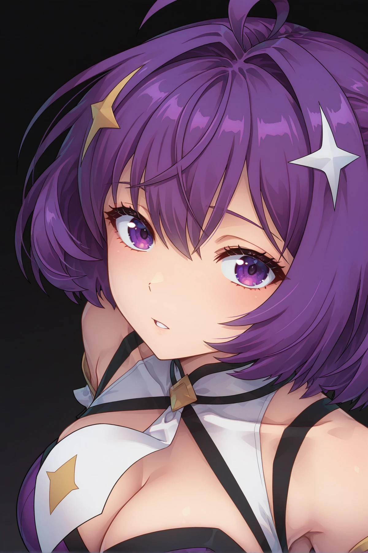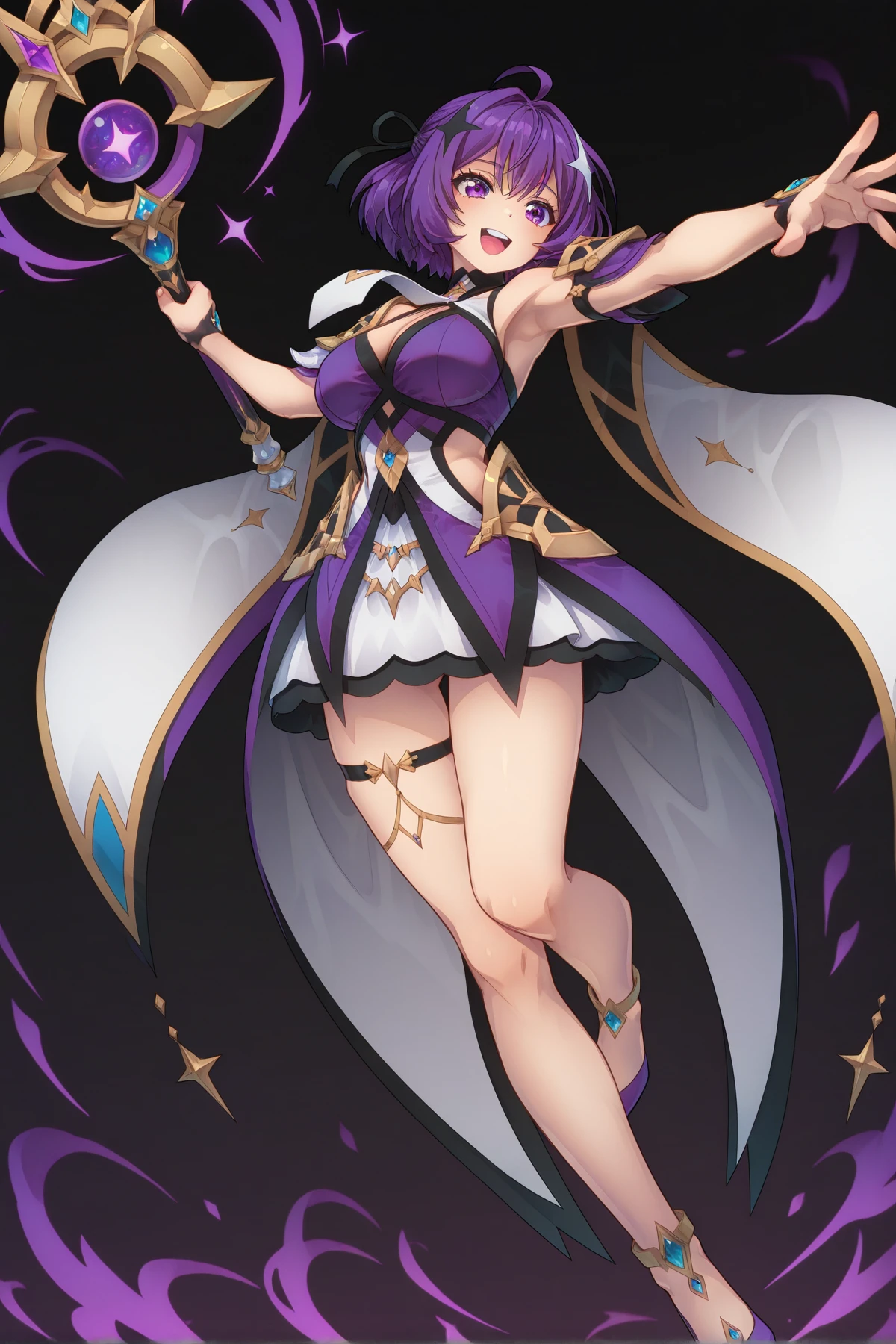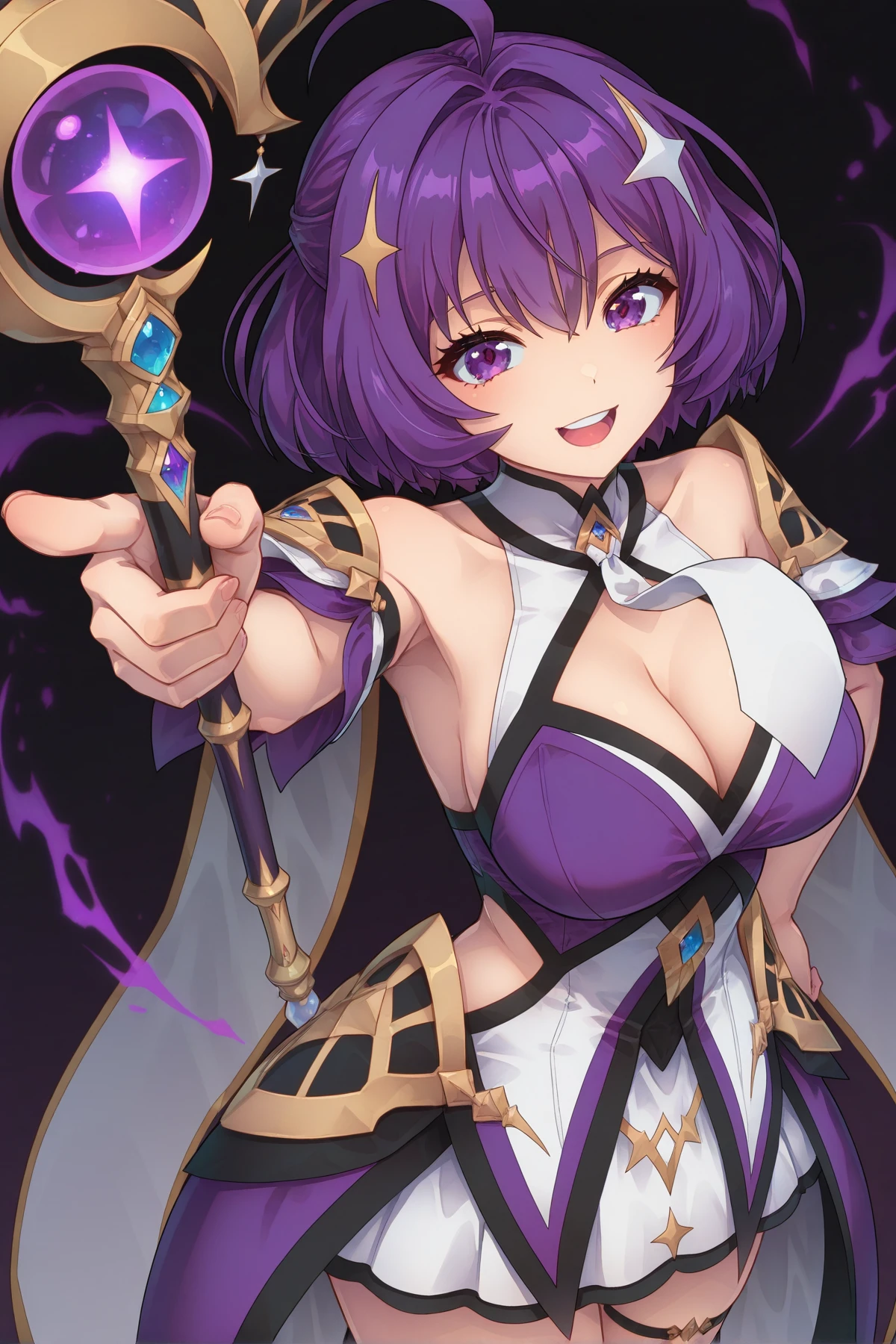 purple eyes, purple hair, short hair, ahoge, hair ornament, large breasts, cleavage, bare shoulders, purple dress, white necktie, detached short sleeves, white skirt, waist pointy cape, purple high heels