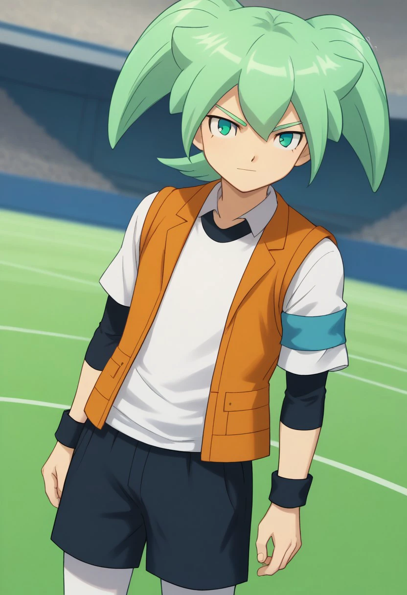 feirun, 1boy, male focus, solo, green hair, twintails, green eyes, sportwear, soccer uniform, garu soccer uniform, shirt, layered sleeves, long over short sleeves, vest, yellow vest, shorts, black shorts, pantyhose, white pantyhose, shoes, black footwear, armband, blue armband