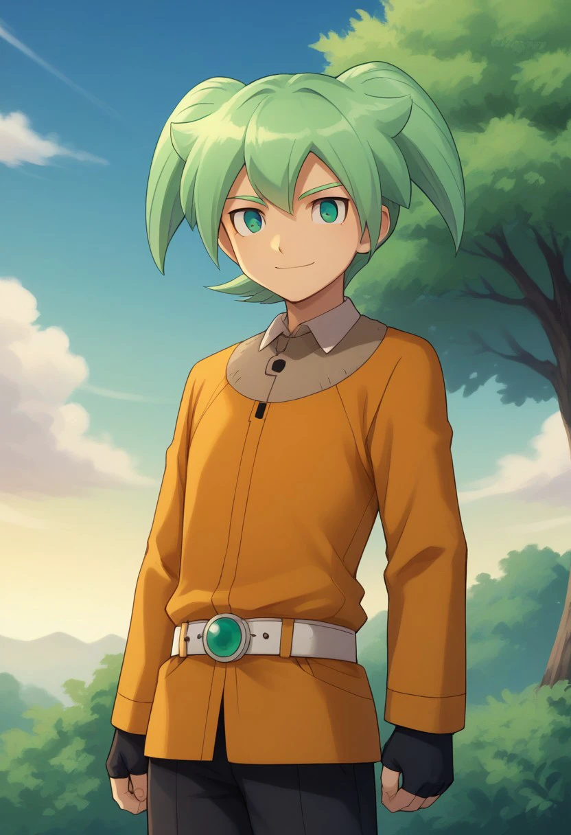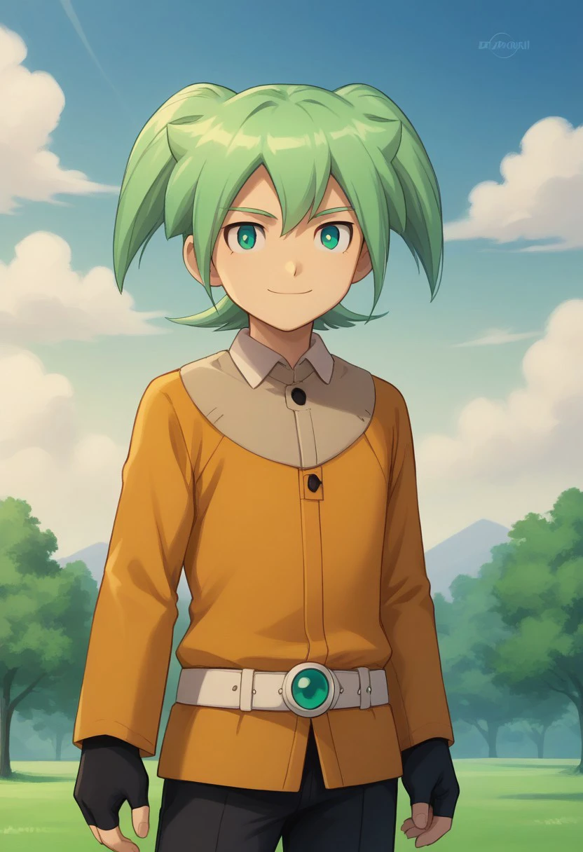 feirun, 1boy, male focus, solo, green hair, twintails, green eyes, headset, jacket, yellow jacket, long sleeves, gloves, black gloves, fingerless gloves, belt, pants, black pants, shoes, white footwear,