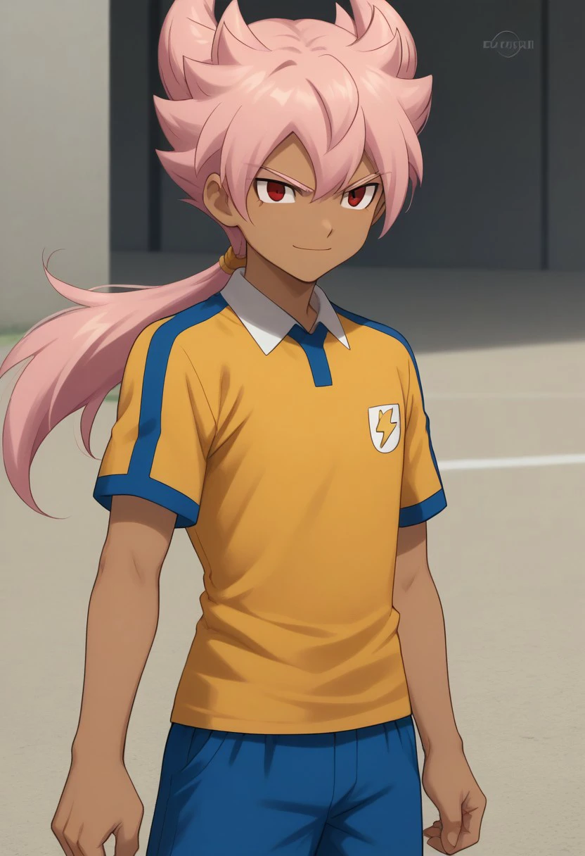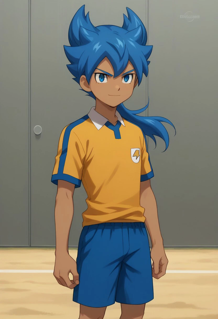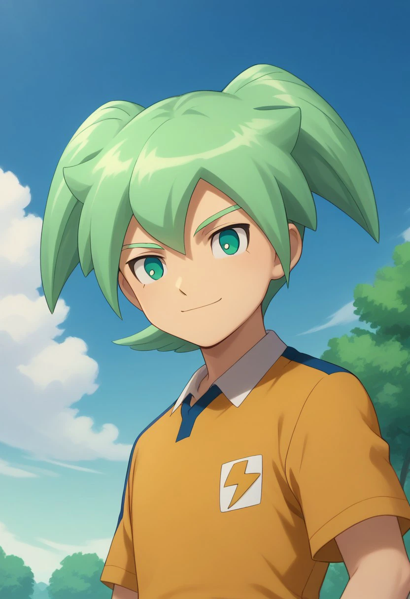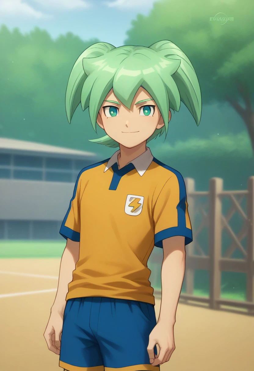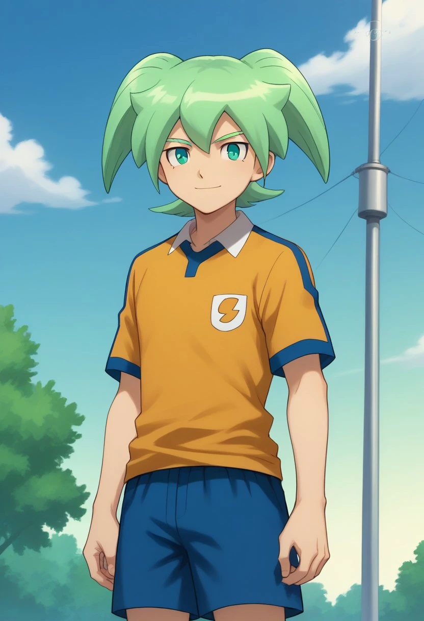 feirun, 1boy, male focus, solo, green hair, twintails, green eyes, sportwear, raimon, raimon soccer uniform, shirt, yellow shirt, short sleeves, shorts, blue shorts, socks, blue socks, shoes,