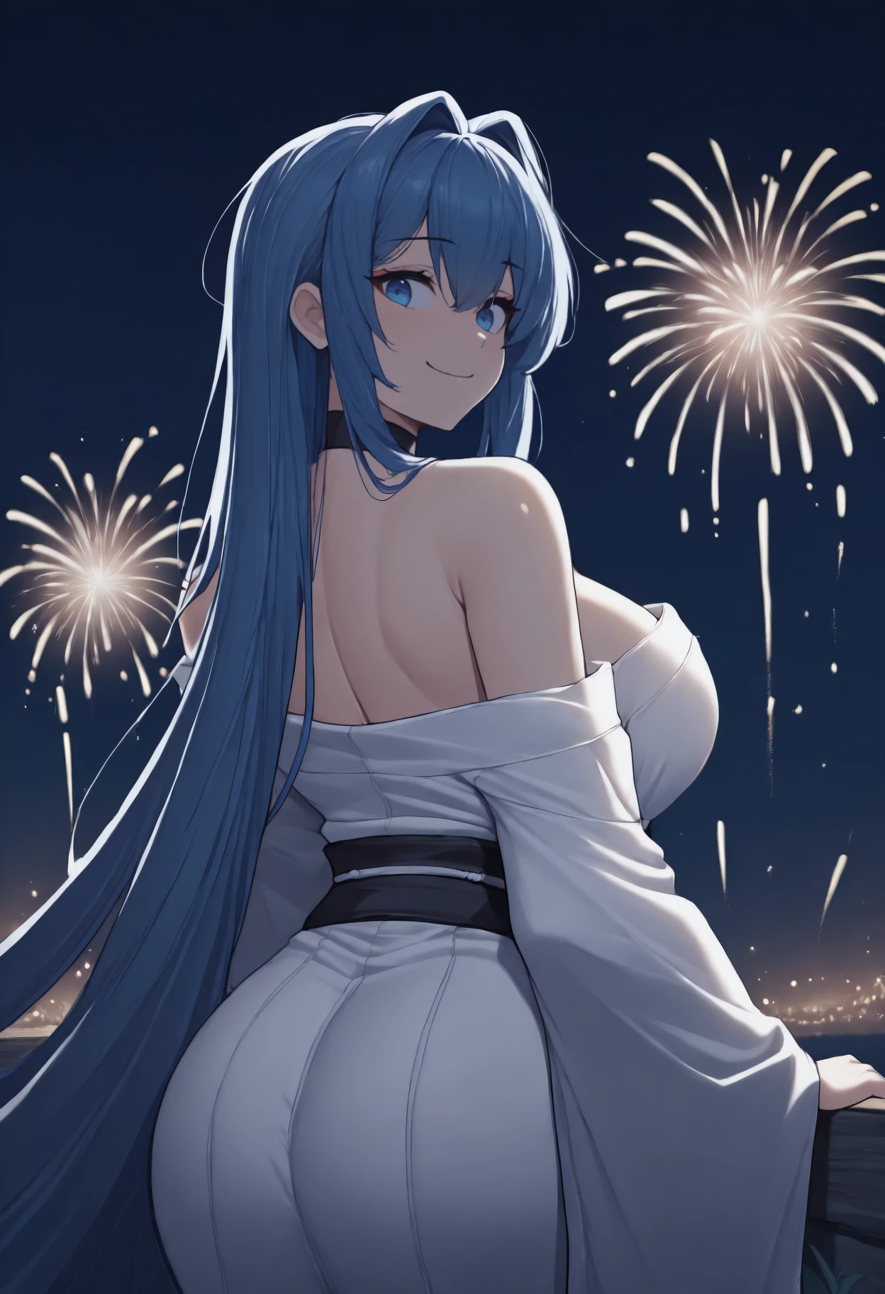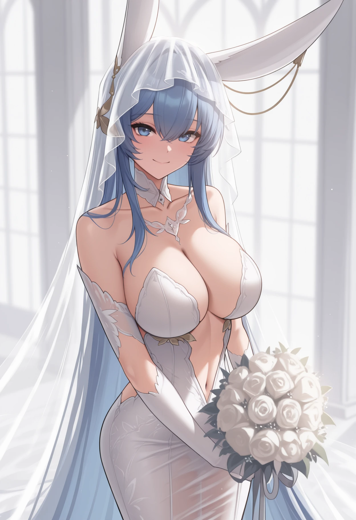 nwjsywed, blue hair, hair between eyes, bridal veil, blue eyes, white dress, wedding dress, see-through dress, backless dress, center opening, detached collar, white gloves, elbow gloves, bare shoulders, collarbone, cleavage, large breasts