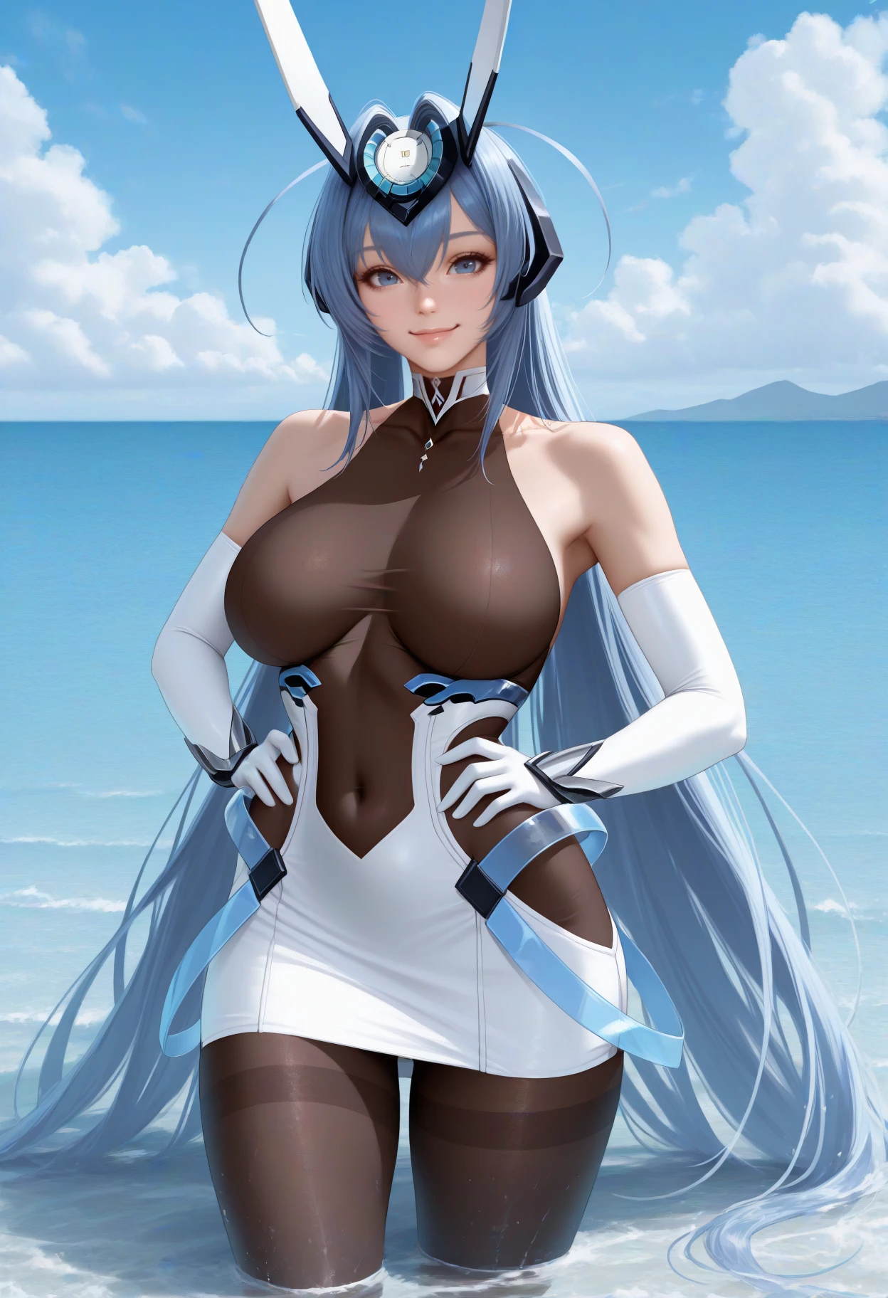 Default Outfit: nwjsydef, blue hair, hair between eyes, sidelocks, hair intakes, headgear, blue eyes, short dress, white dress, side cutout, bodystocking, covered collarbone, covered navel, white gloves, elbow gloves, black pantyhose, thighband pantyhose, bare shoulders, large breasts
