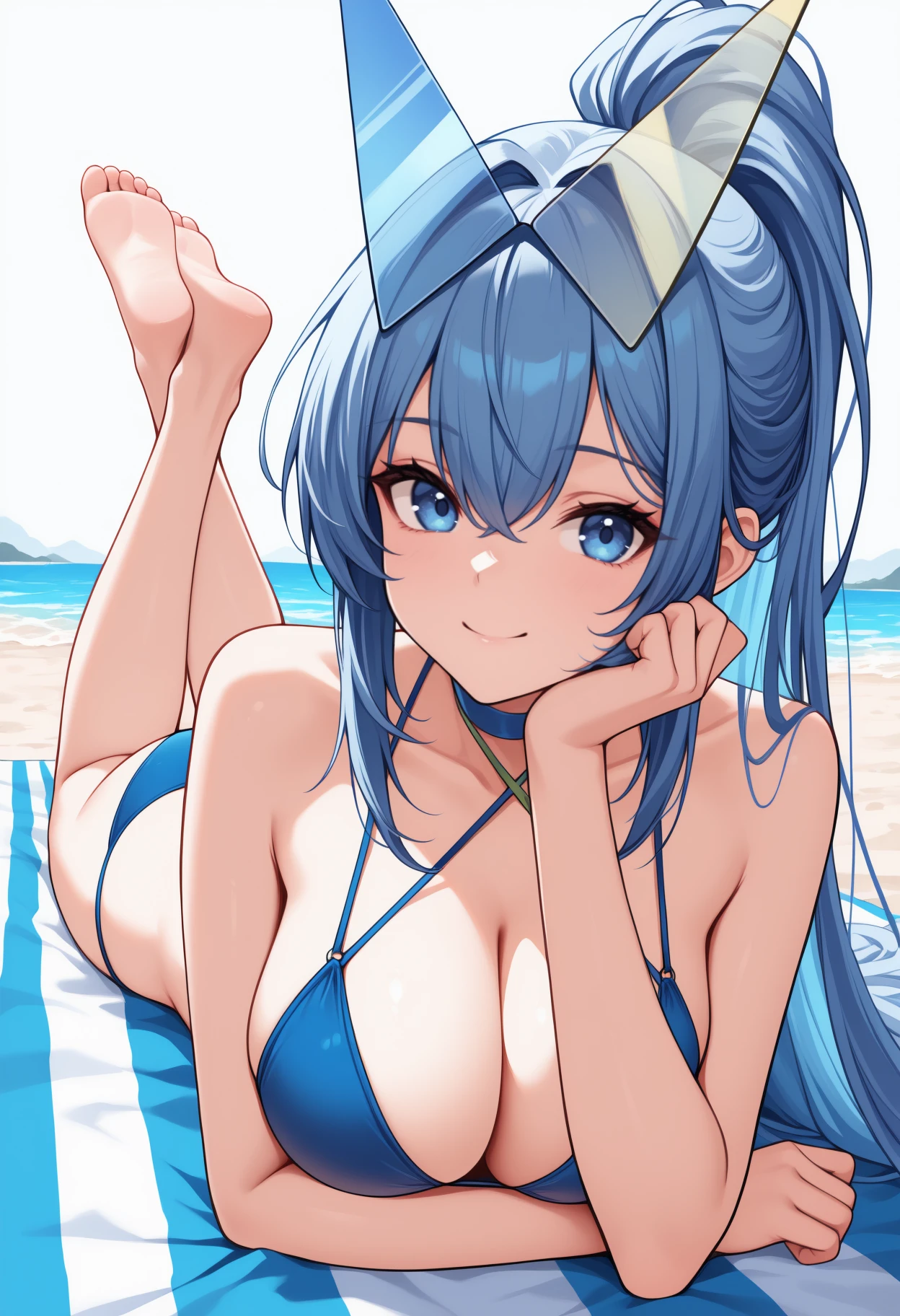 Midsummer Leisure: nwjsysummer, blue hair, hair between eyes, sidelocks, high ponytail, tinted eyewear, eyewear on head, blue eyes, blue bikini, string bikini, halterneck, criss-cross halter, blue choker, bare shoulders, collarbone, navel, cleavage, large breasts