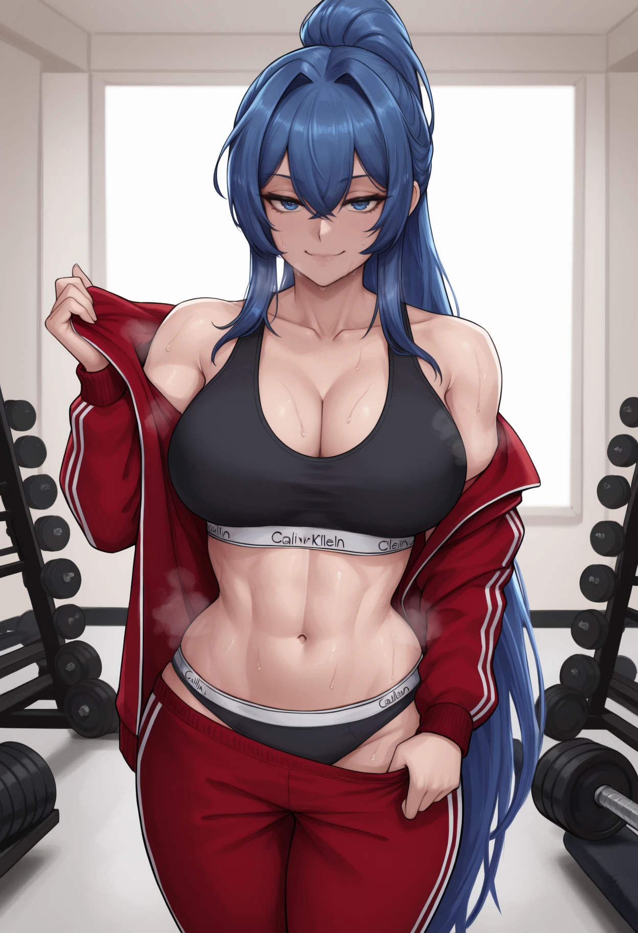 nwjsysummer, blue hair, hair between eyes, sidelocks, high ponytail, tinted eyewear, eyewear on head, blue eyes, blue bikini, string bikini, halterneck, criss-cross halter, blue choker, bare shoulders, collarbone, navel, cleavage, large breasts
