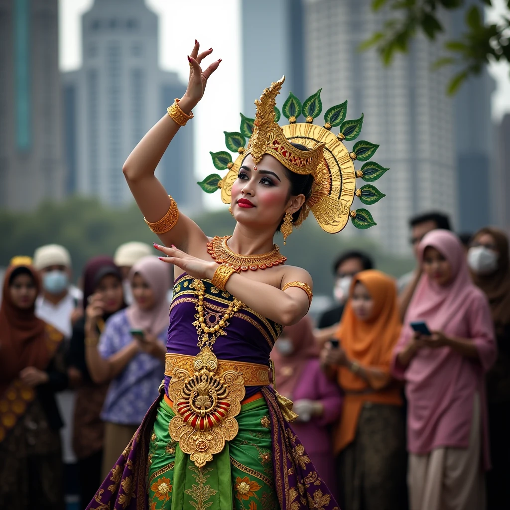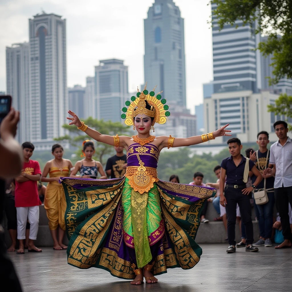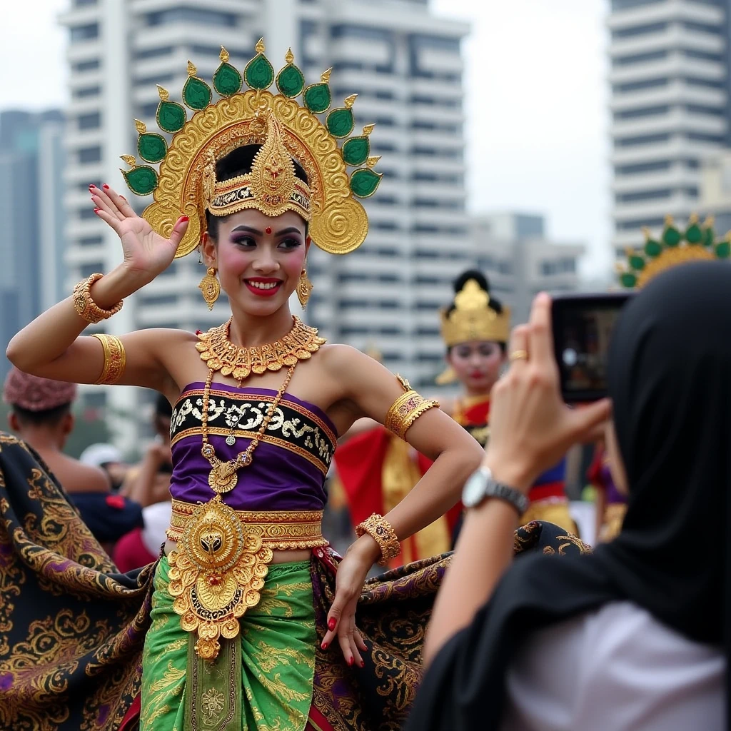 balidancer, high rise building backgrounds, indonesian tourists take photo of balidancer, some wearing hijab, bokeh, cinematic, soft light, focus, using NIKON, ultra realistic, HD, quality boost