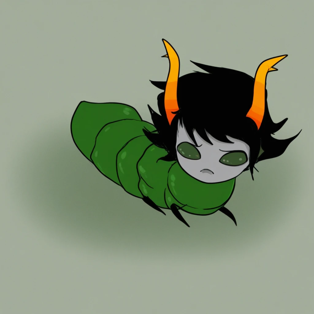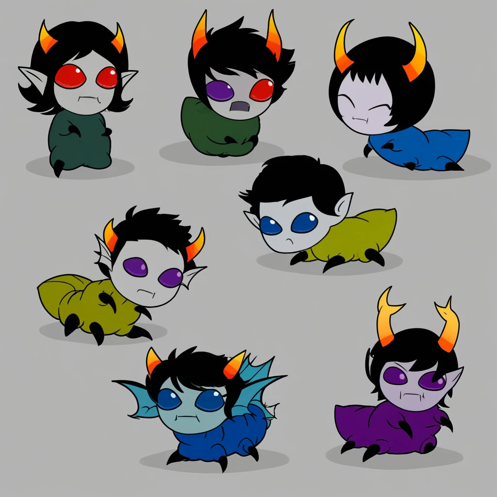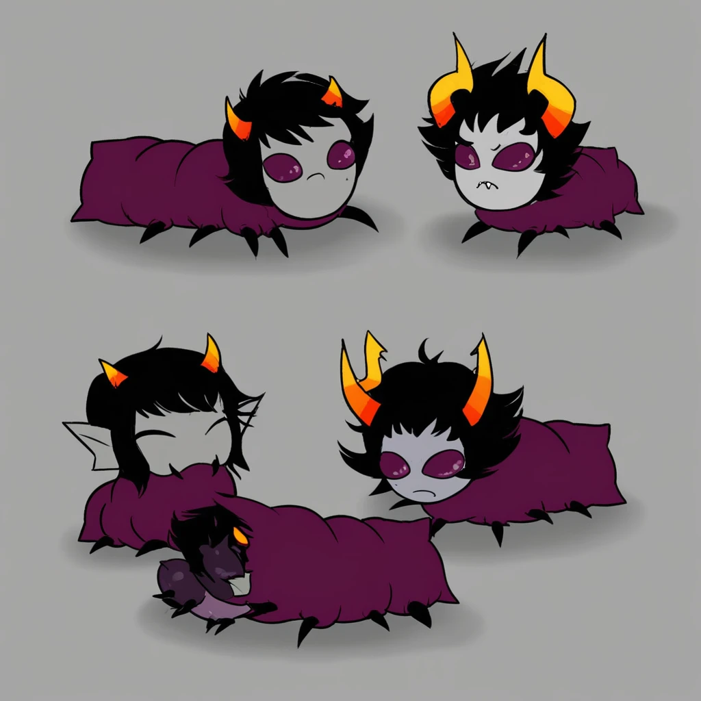 grey skin, black hair, horns,