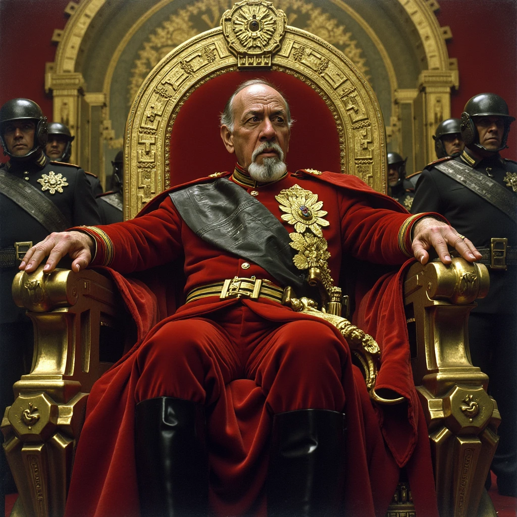 Emperor Shaddam IV, as portrayed by José Ferrer in Dune (1984), exudes an air of regal authority tempered by veiled insecurity. Draped in the opulent finery of House Corrino, his golden-trimmed uniform and high collar lend him an imposing presence, but beneath the grandeur lies a ruler whose grip on power is more precarious than he dares admit. Ferrer’s Shaddam is a calculating sovereign, his clipped, measured speech revealing a man accustomed to command, yet wary of the shifting sands of political intrigue. His piercing gaze, equal parts arrogance and unease, betrays the quiet paranoia of an emperor who knows the throne he occupies is only as secure as the alliances he maintains. In his every gesture—whether in the halls of power or beneath the gaze of the Spacing Guild Navigators—there is the weight of dynastic expectation, a ruler watching the empire he has built begin to slip through his fingers like the sands of Arrakis.