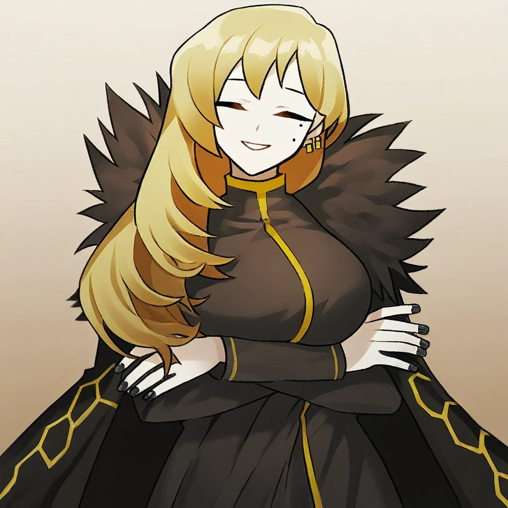 binah_(project_moon), black jacket, black dress, dress, jacket, earrings, shirt, black hair, yellow hair undertone, large breasts, black eyes, fur trim, long hair