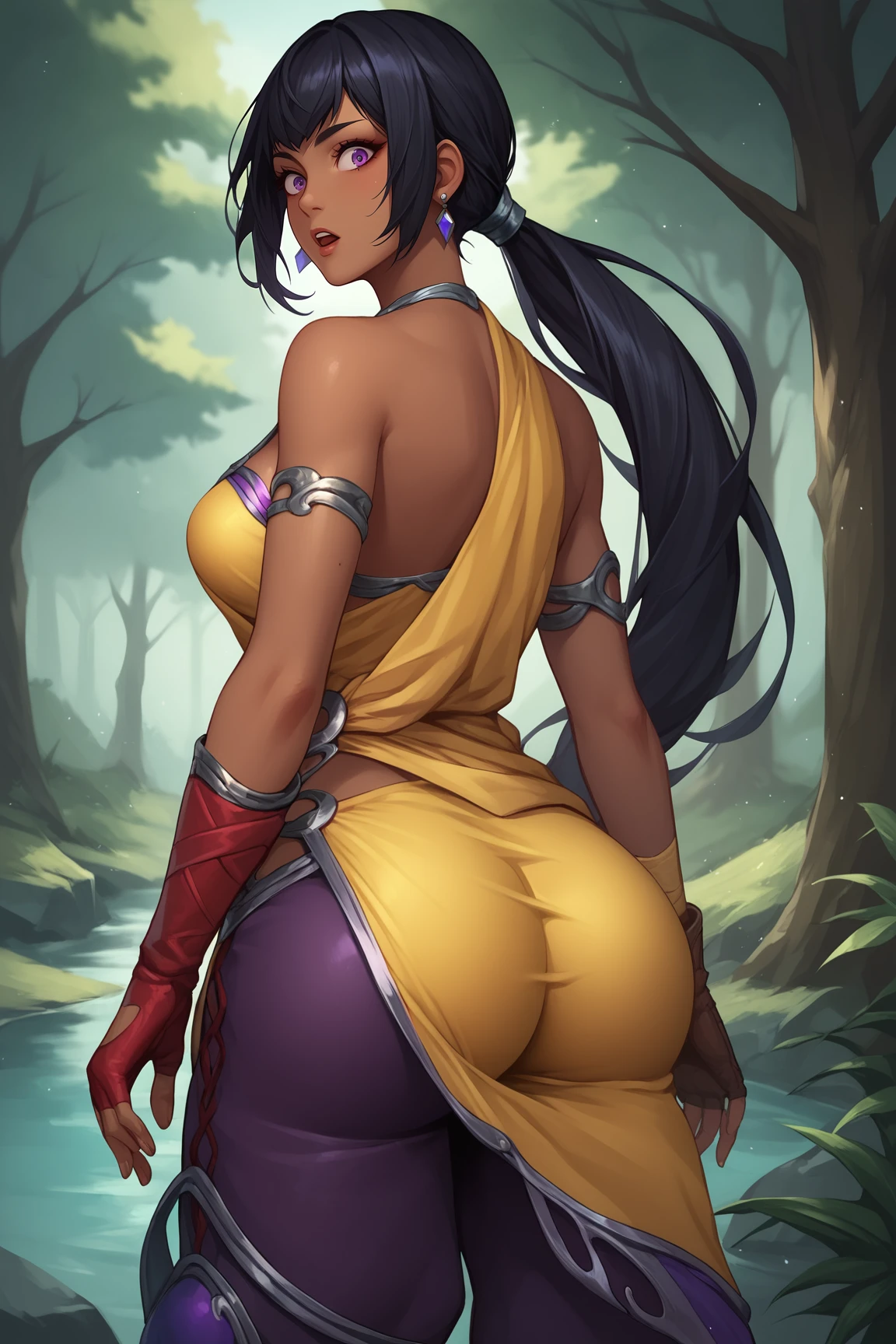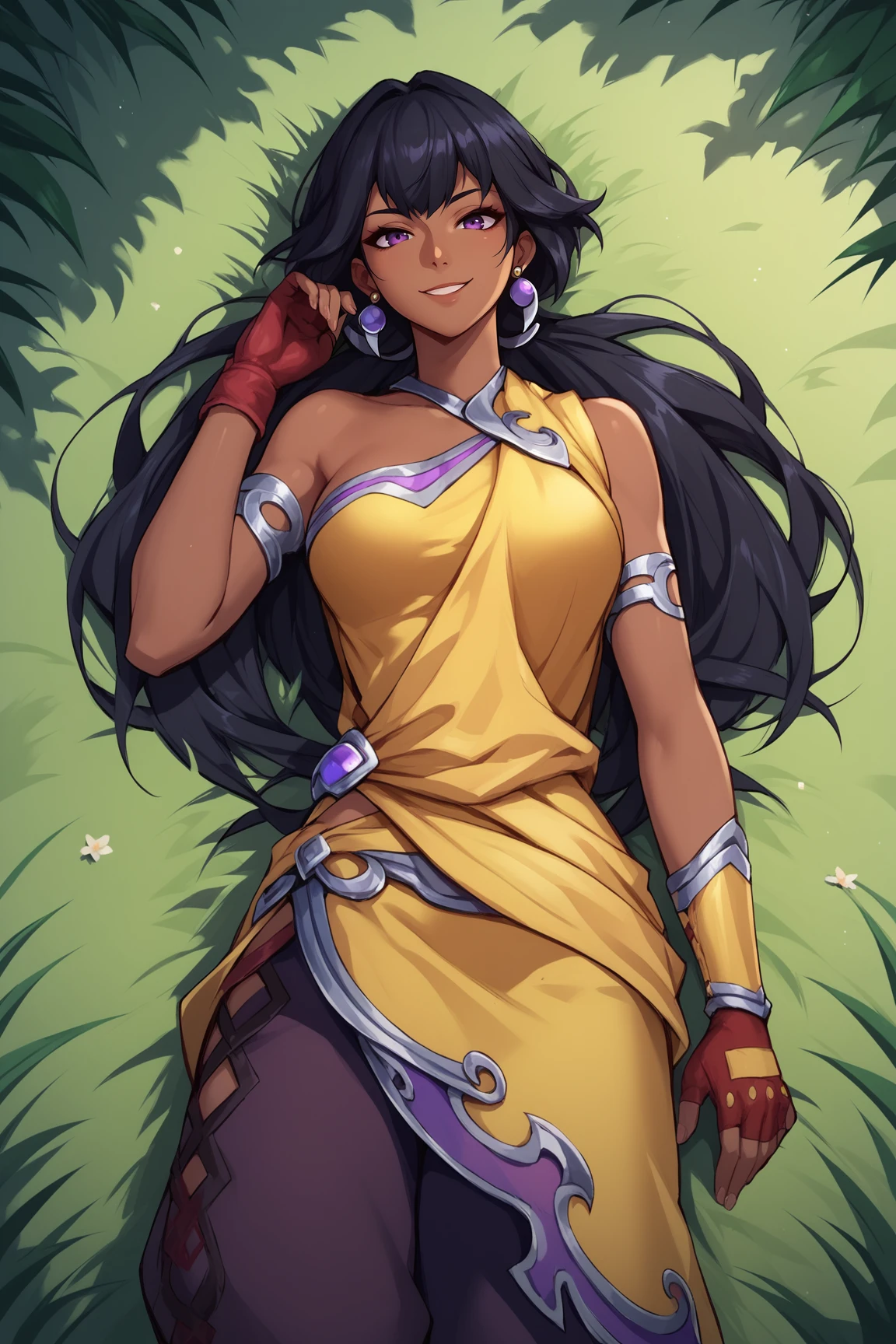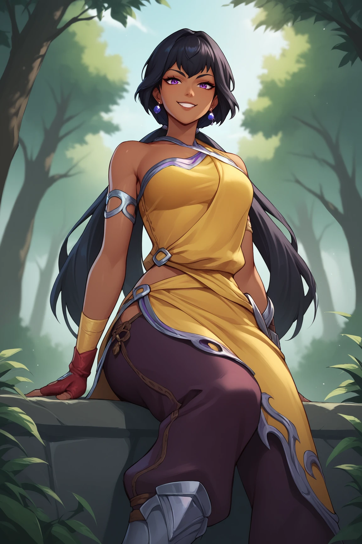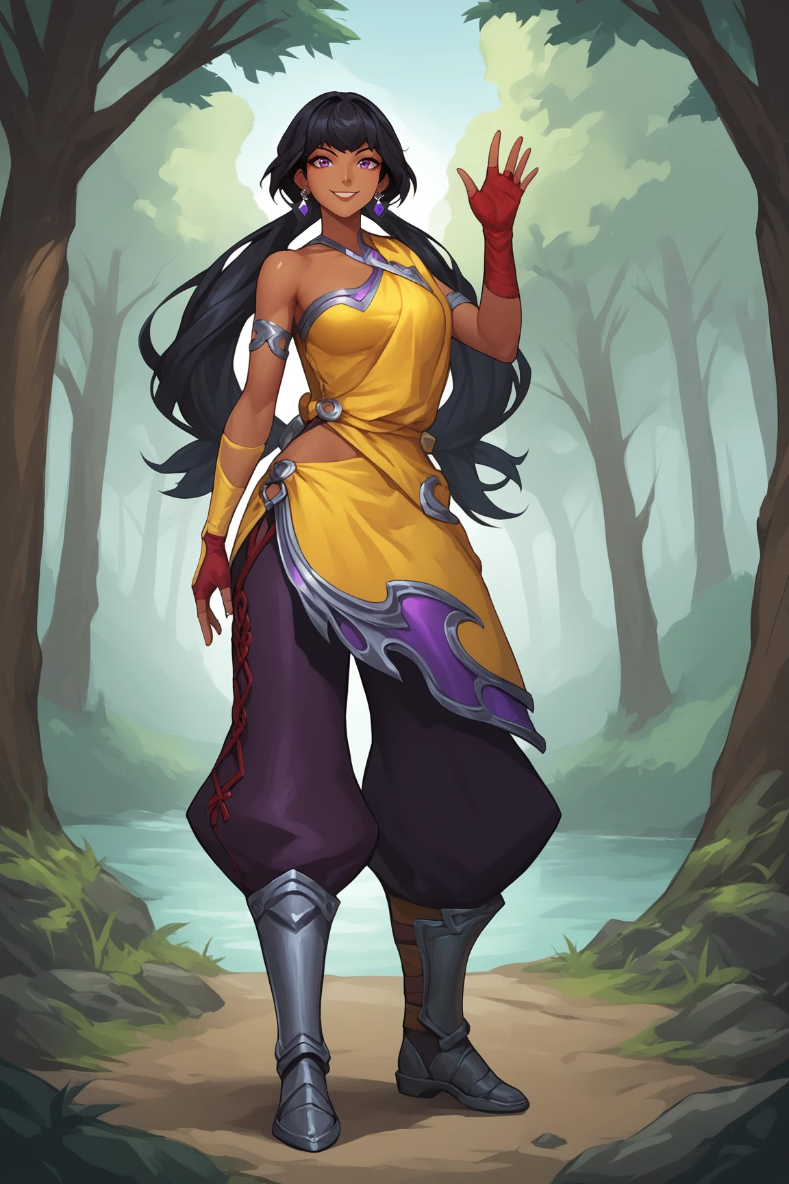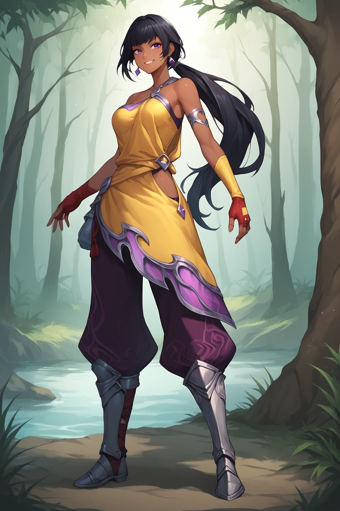 NilahLoLXL, dark skin, colored skin, purple eyes, black hair, long hair, bangs, ponytail, sidelocks, blue earrings, medium breasts, bare shoulder, yellow dress, armlet, yellow vambraces, single red glove, fingerless glove, purple pants, baggy pants, armored boots