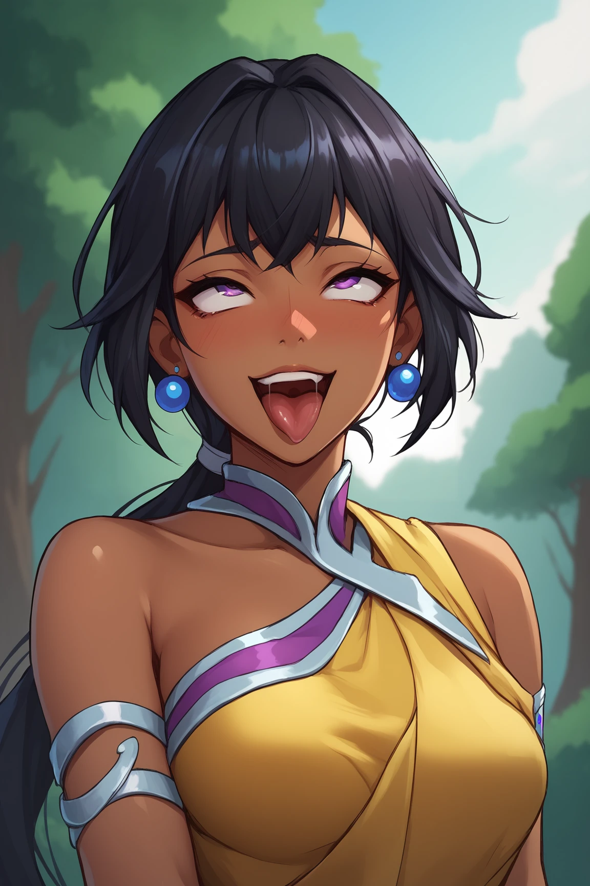 ➜ NilahLoLXL, dark skin, colored skin, purple eyes, black hair, long hair, bangs, ponytail, sidelocks, blue earrings, medium breasts, bare shoulder, yellow dress, armlet, yellow vambraces, single red glove, fingerless glove, purple pants, baggy pants, armored boots