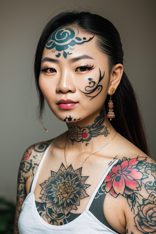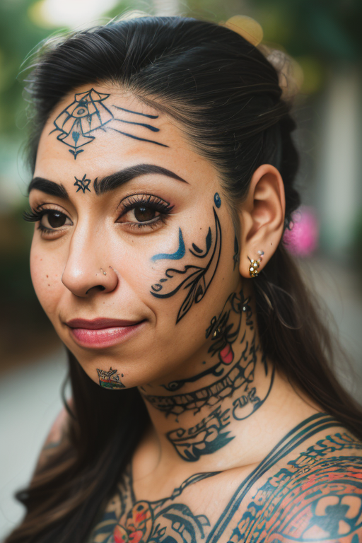 Disclaimer: Some models used in my sample images (such as Realistic Vision and Ally's Mix III) can do face tattoos on their own. You don't really need this LoRA with those models. Or, if unfortunaltely you have trouble with those models generating face tattoos, use this LoRA as an enhancer.