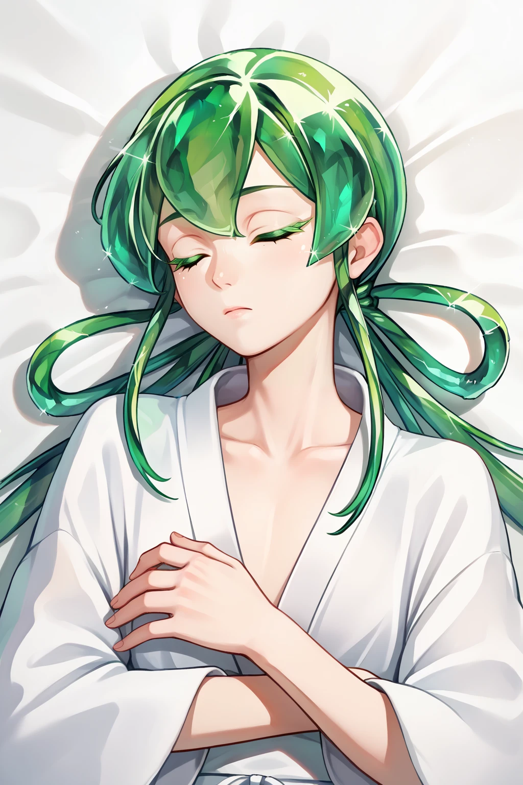 hskjd, green eyes, white skin, crystal hair, colored eyelashes, long hair, hair rings