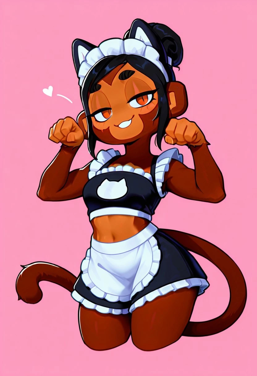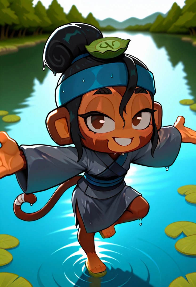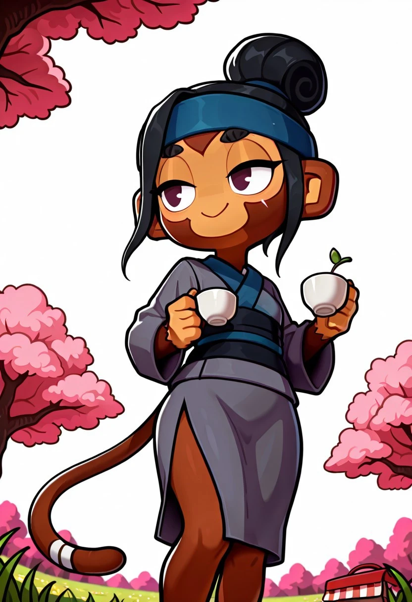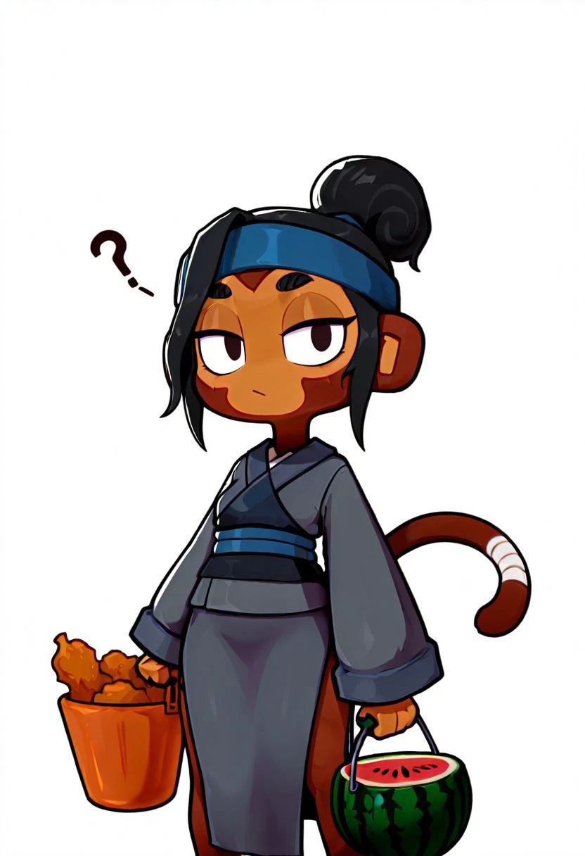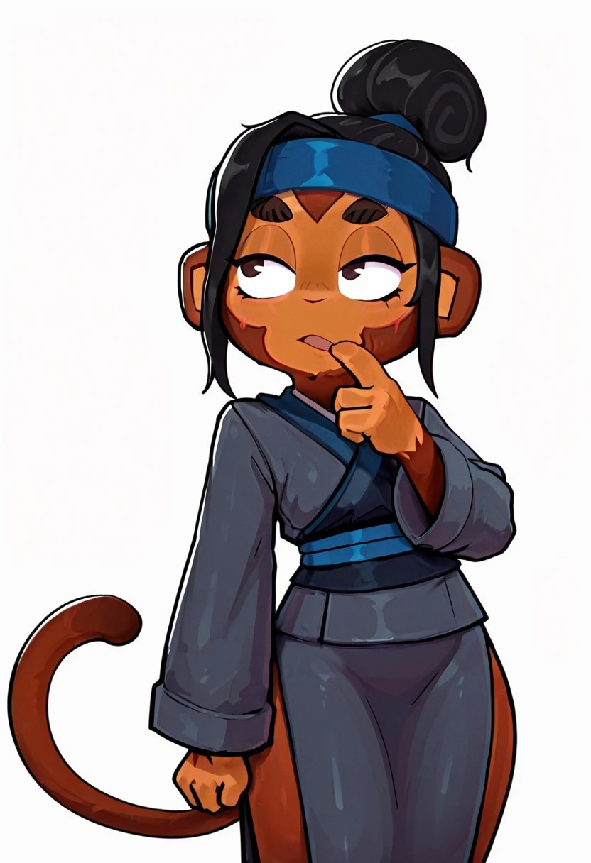 saudabtd6, 1girl, solo, black hair, tail, dark skin, hair bun, furry, single hair bun, animal ears, brown fur, monkey tail, blue headband, long sleeves, grey kimono, blue belt,