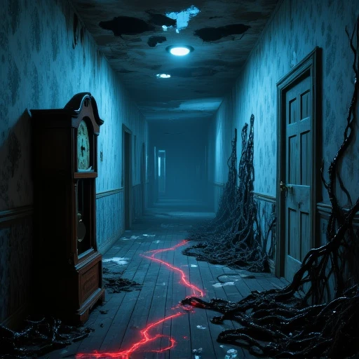 dark surreal landscape, horror environment, alien dimension, cold blue ambient light, red glowing clouds, atmospheric fog, glowing white dust, floating ash particles, desaturated colors, eerie silence, corrupted nature, black tendrils, glowing red veins, cinematic horror lighting, decayed architecture, unnatural stillness, haunted mood, soft fog layering, lifeless atmosphere, pale bluish tones, surreal world design, pulsing organic textures, dreamlike horror, frozen reality, abandoned structures, rotting surfaces, high contrast lighting, horror-inspired decay, oppressive environment, slow-motion atmosphere