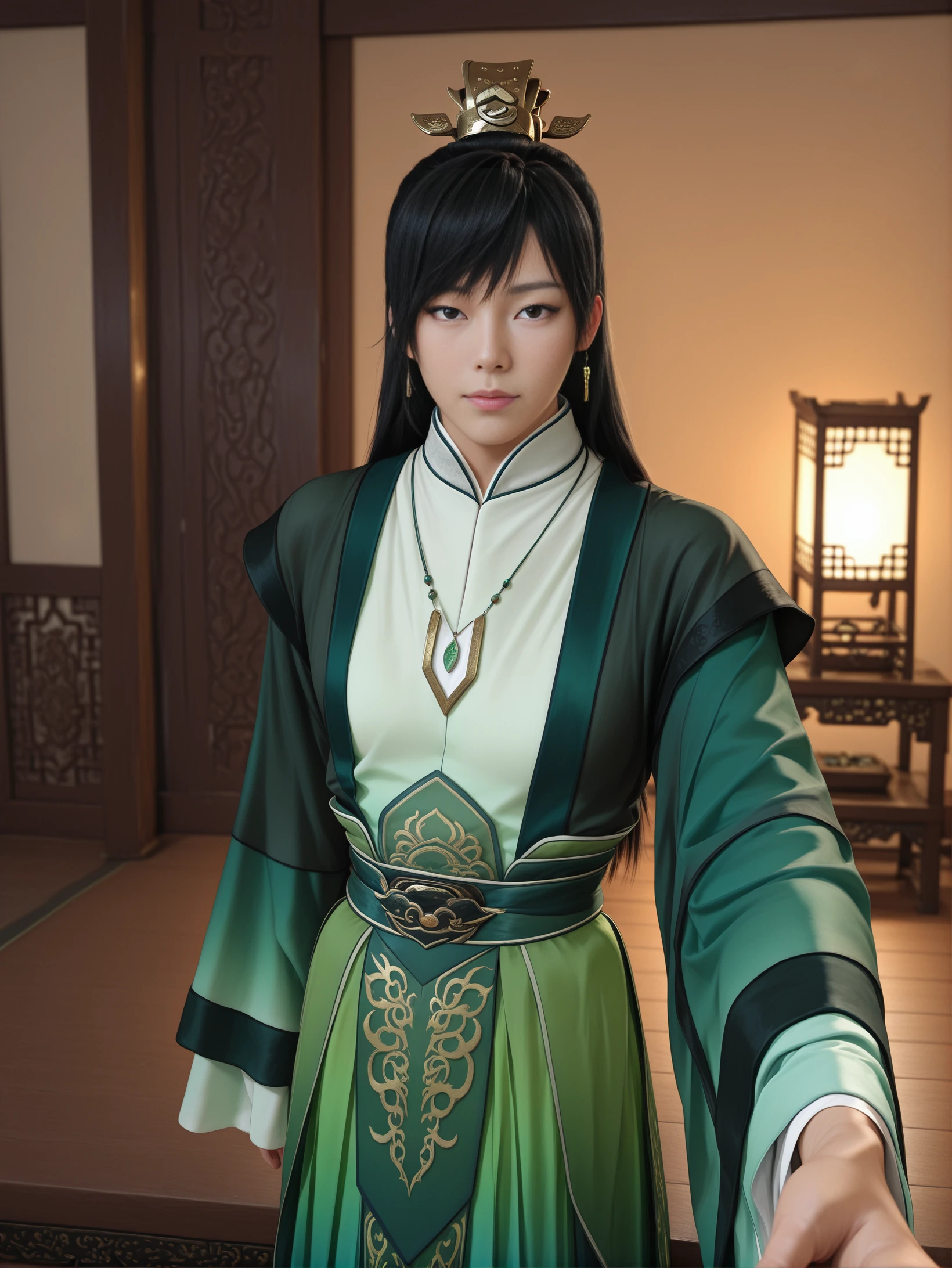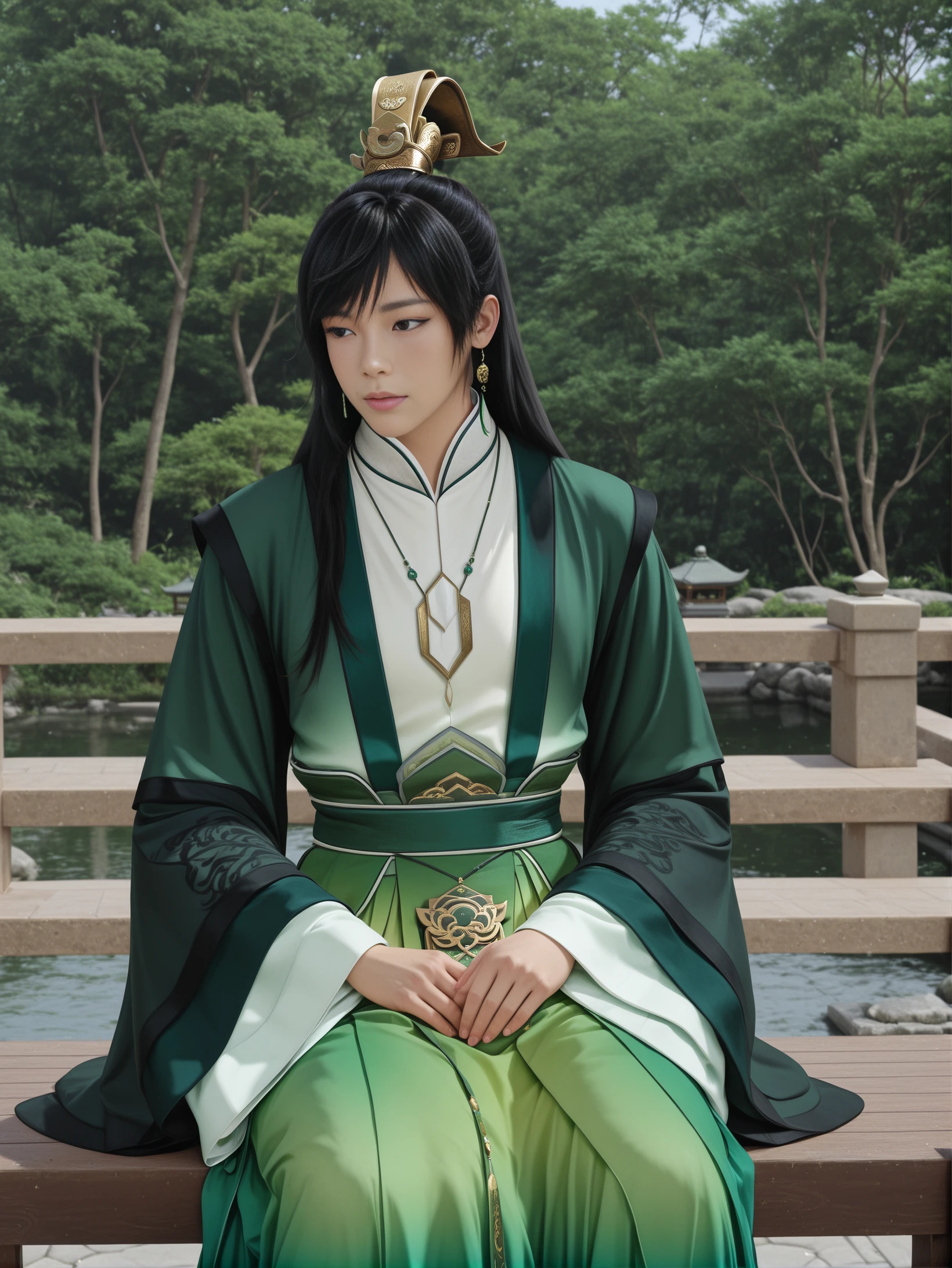 mgz, solo, black hair, hanfu, headpiece, long hair, realistic, long sleeves, pendant, gradient dress, wide sleeves