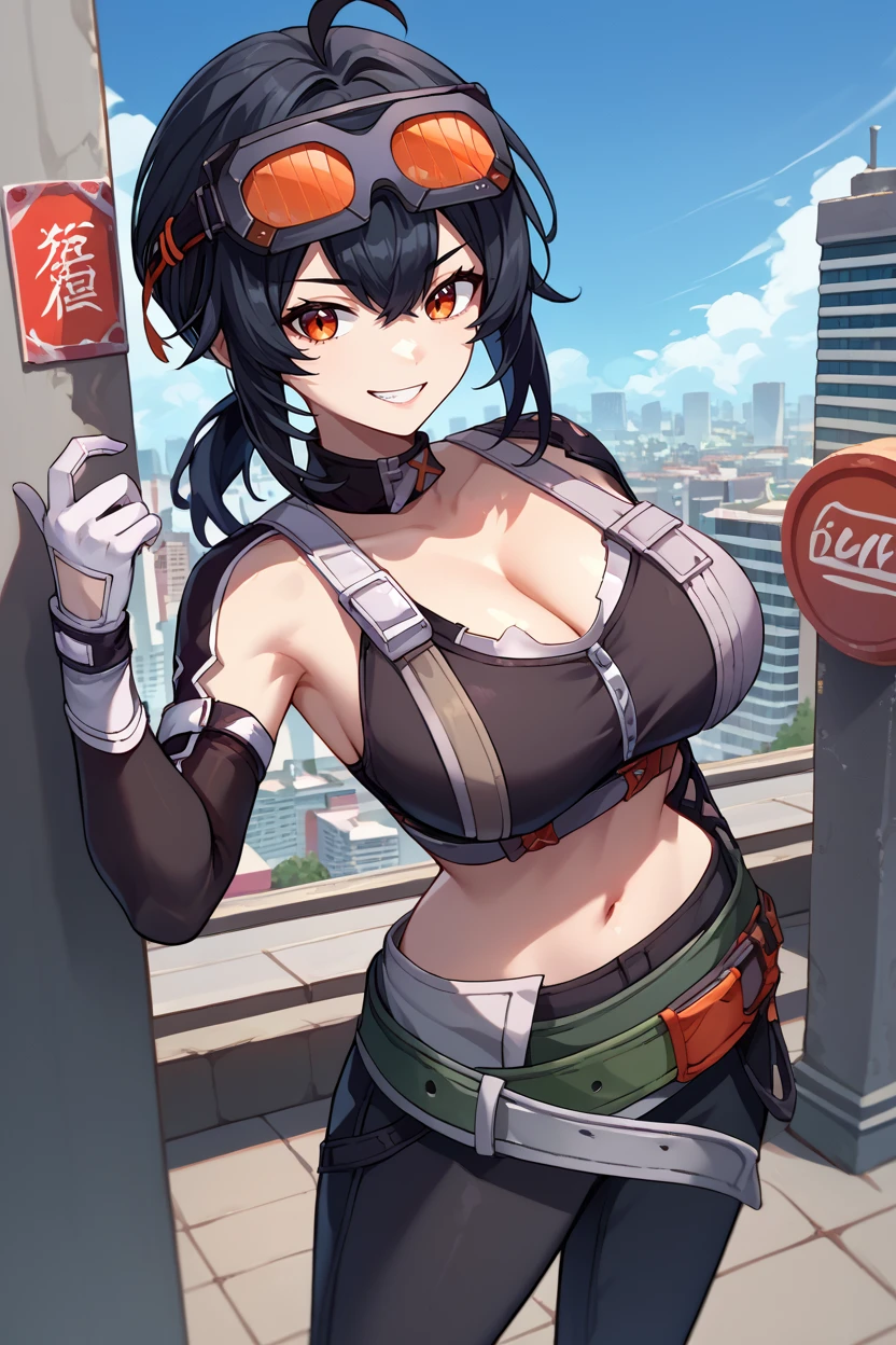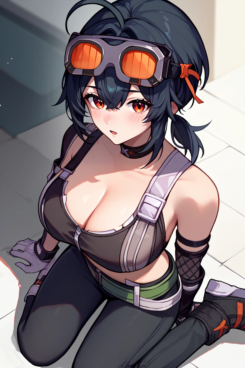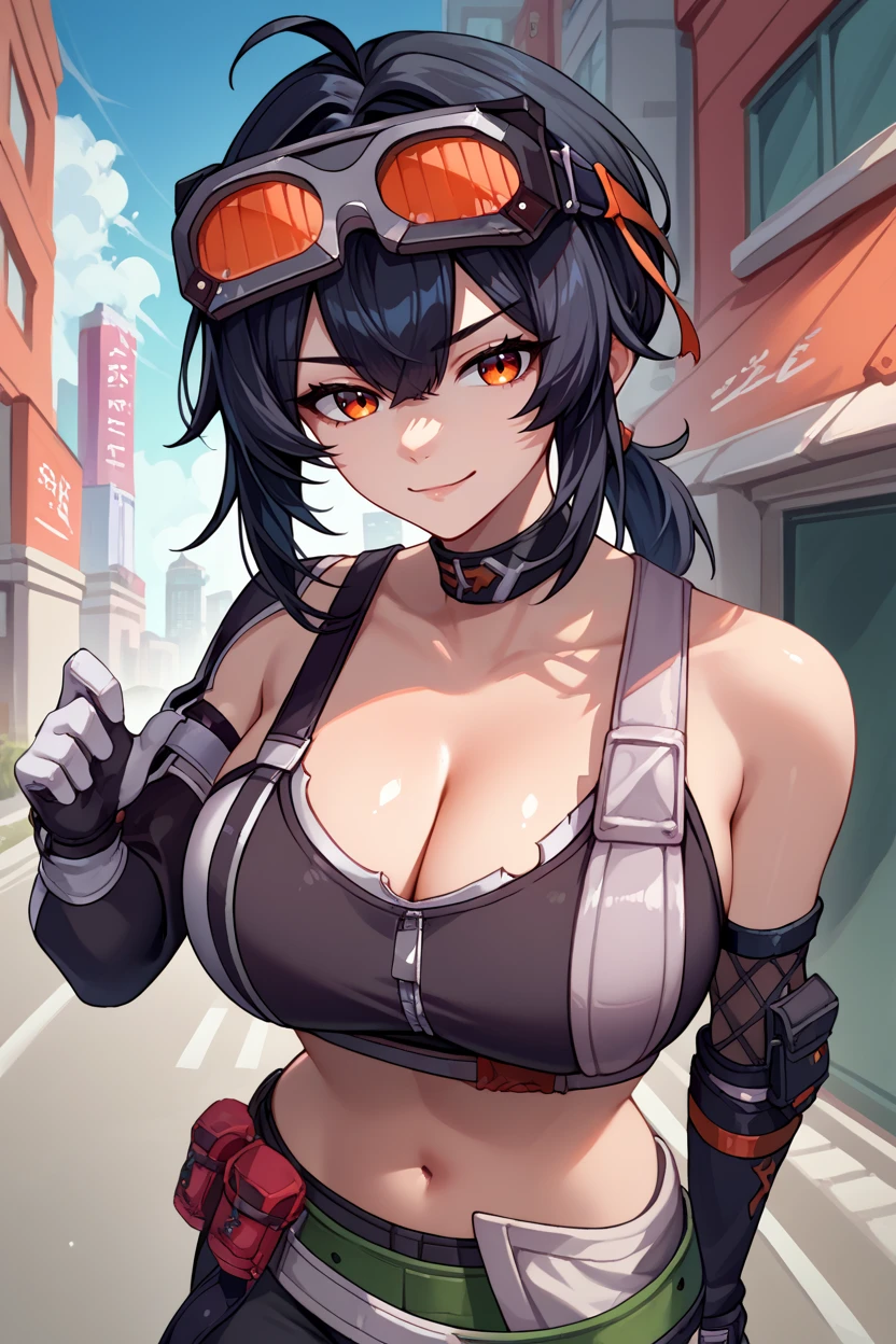 goggles on head, choker, black crop top, cleavage, sleeveless, detached sleeves, asymmetrical gloves, belt, black pants, skin tight