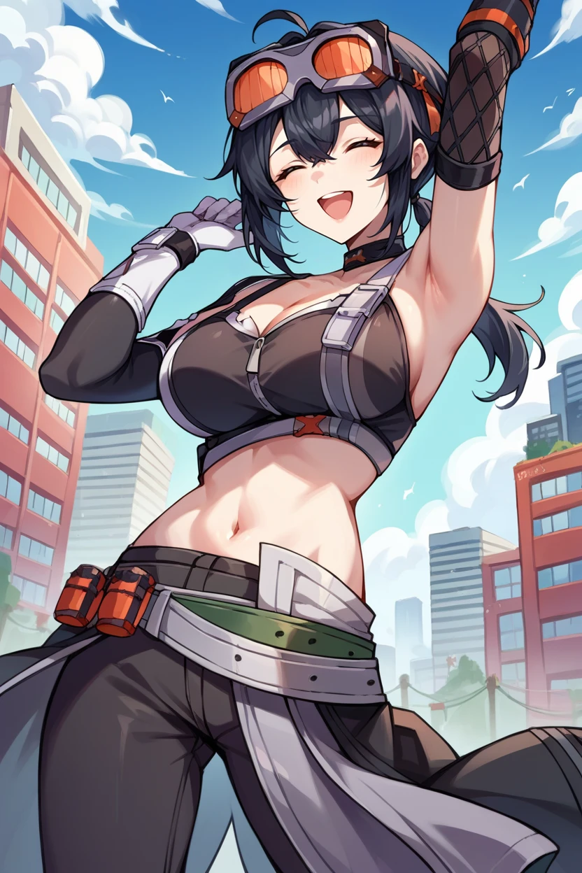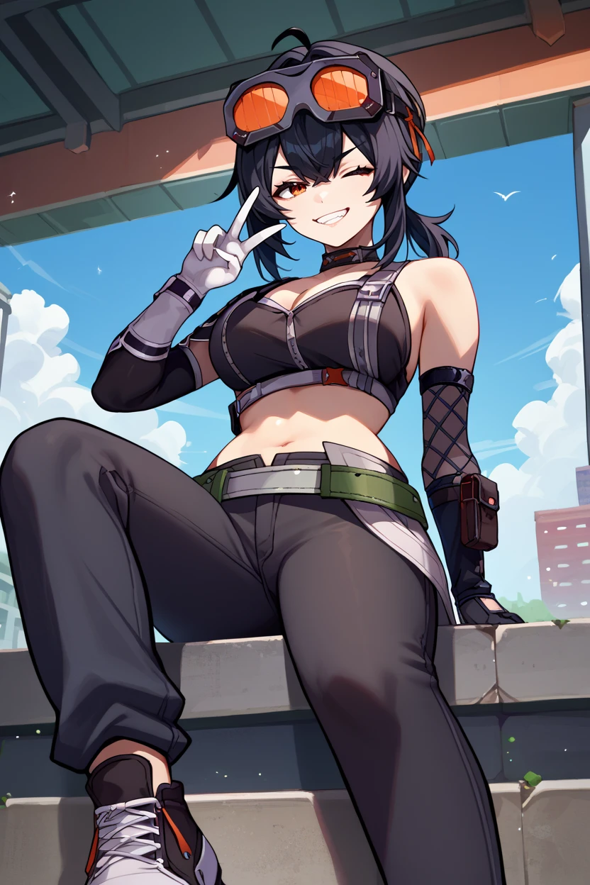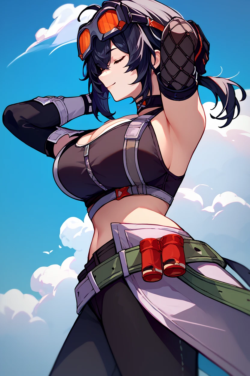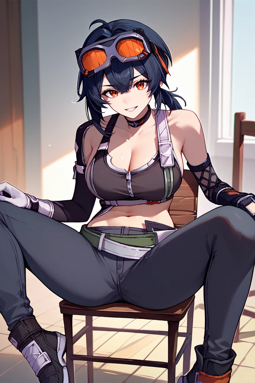 goggles on head, choker, black crop top, cleavage, sleeveless, detached sleeves, asymmetrical gloves, belt, black pants, skin tight
