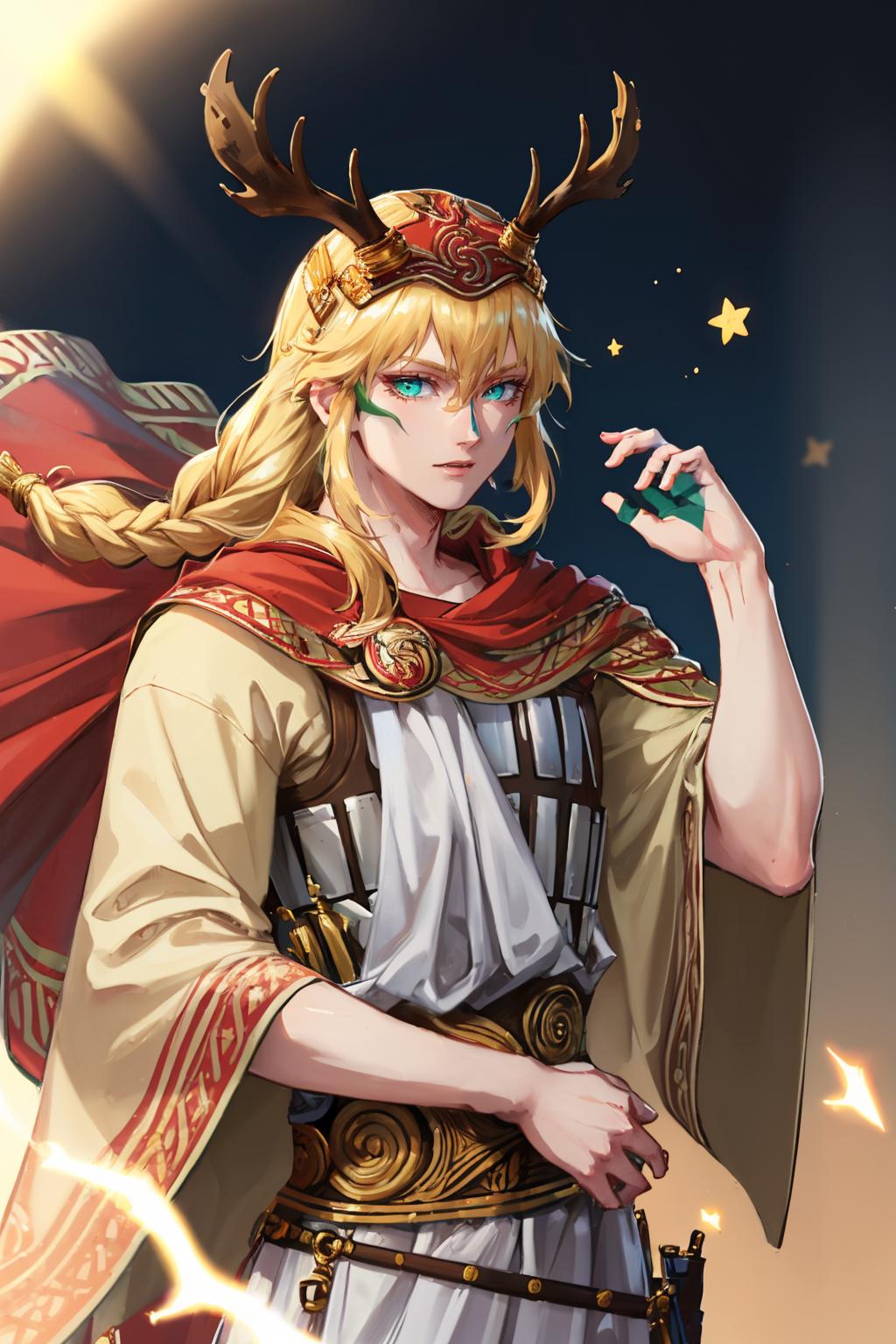 Tags: fionnsmt, blonde hair, long hair, antlers, green eyes, braid, cape, facial mark, 1boy