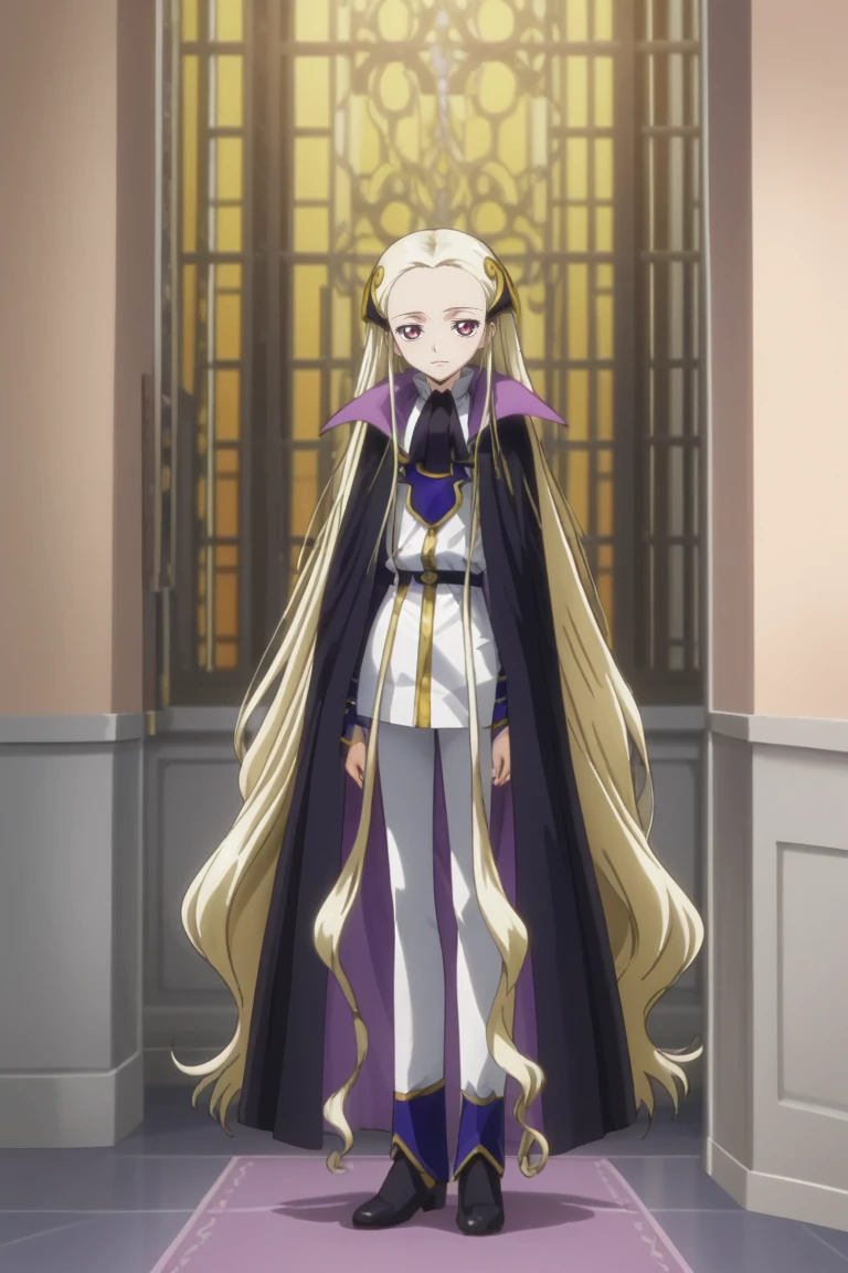 cloak, white tunic, white pants, black shoes, ascot, hair ornament