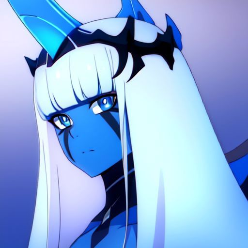 prompts: 1girl, solo, horns, long hair, looking at viewer, blue eyes, blue skin,(unusual pupils), bangs,, blue horns, white hair, horns, very long hair, blue skin, tail,