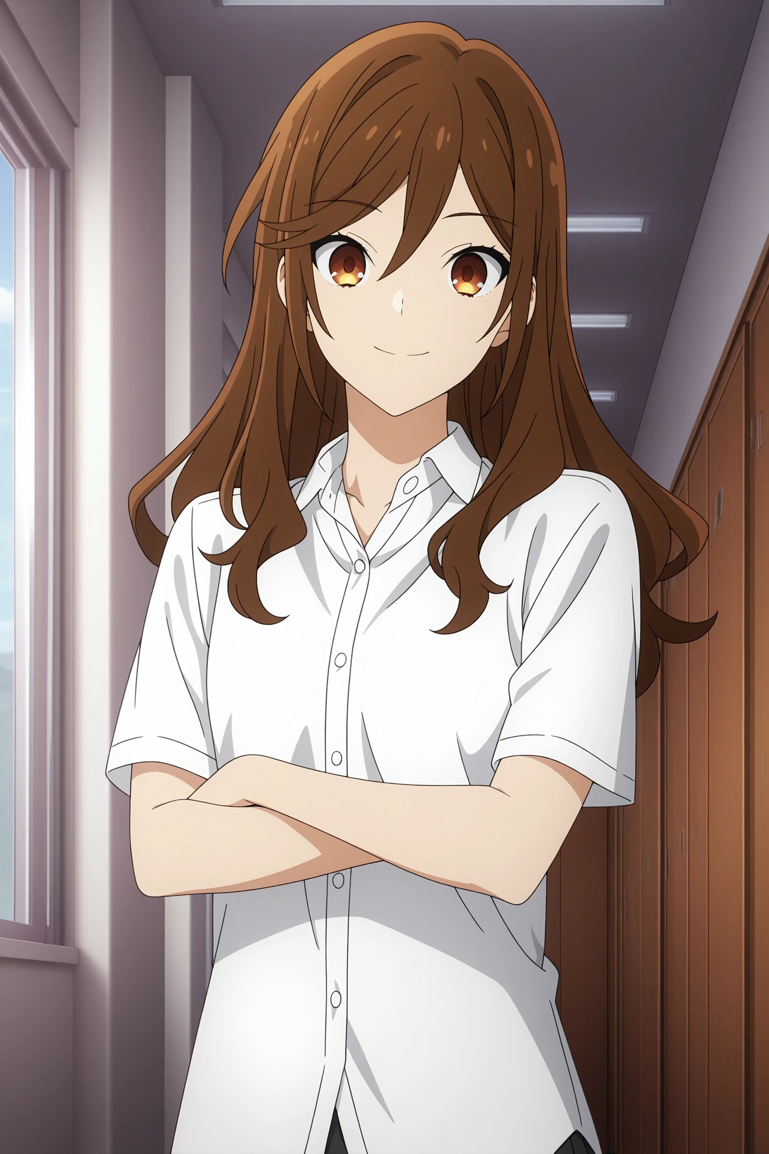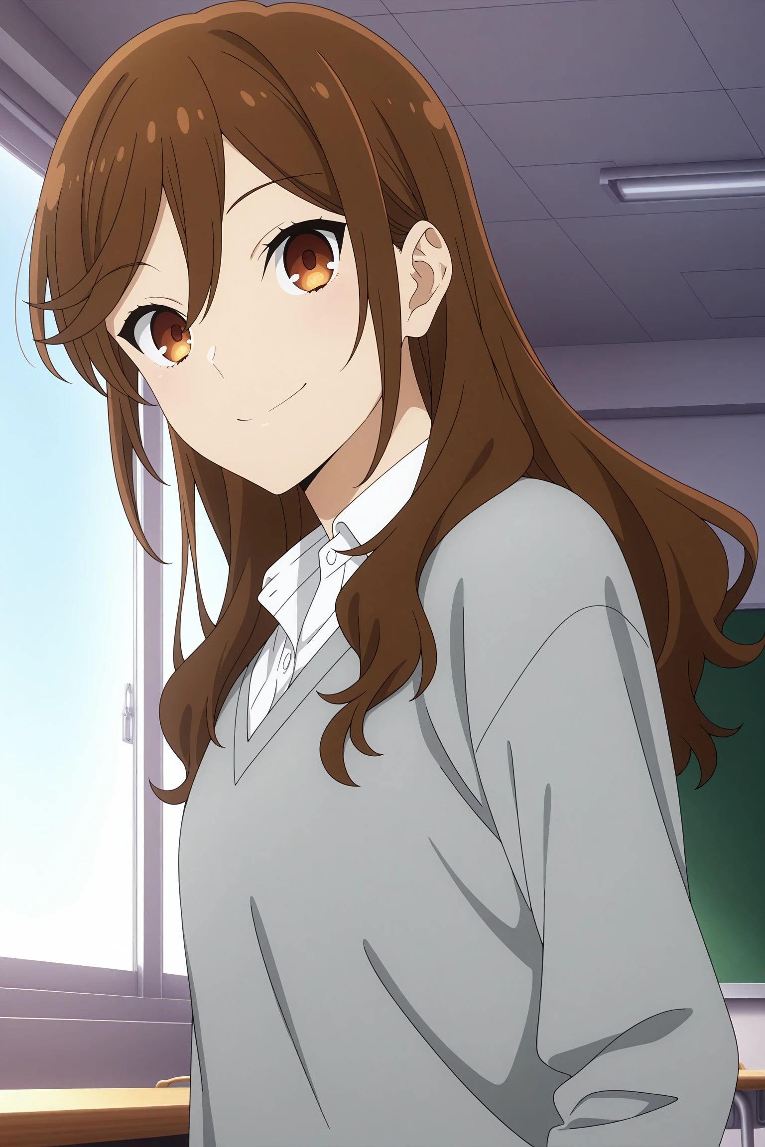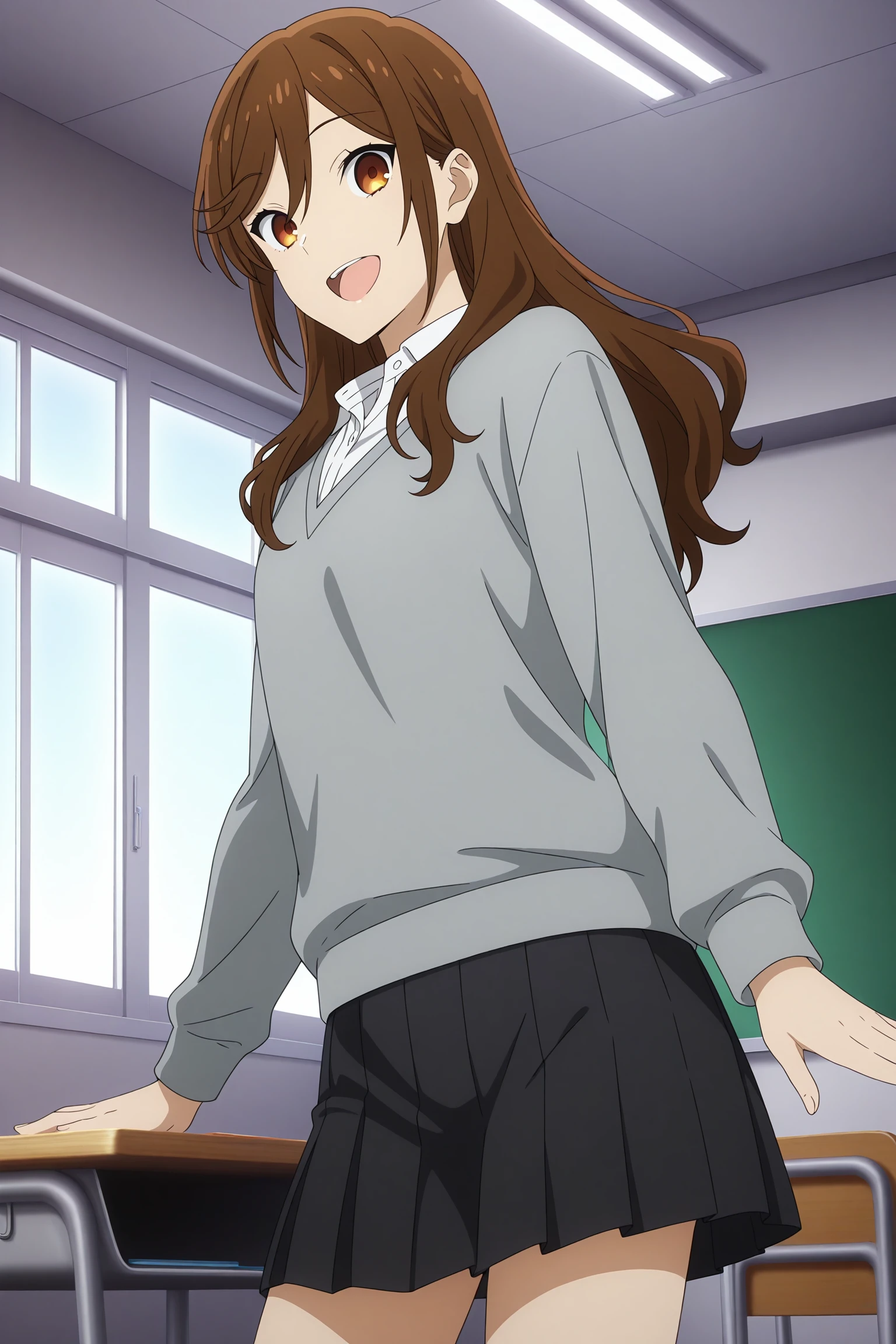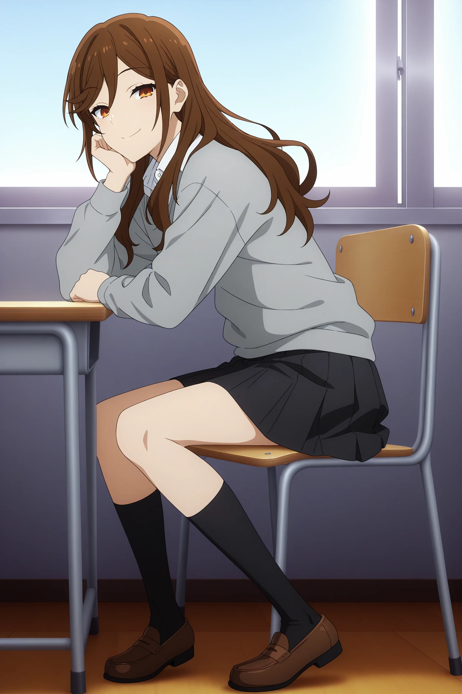 hori kyouko, long hair, brown hair, swept bangs, hair between eyes, long sleeves, grey sweater, white shirt, collared shirt, black skirt, pleated skirt, black socks, kneehighs, loafersSchool Uniform 2 (Summer)